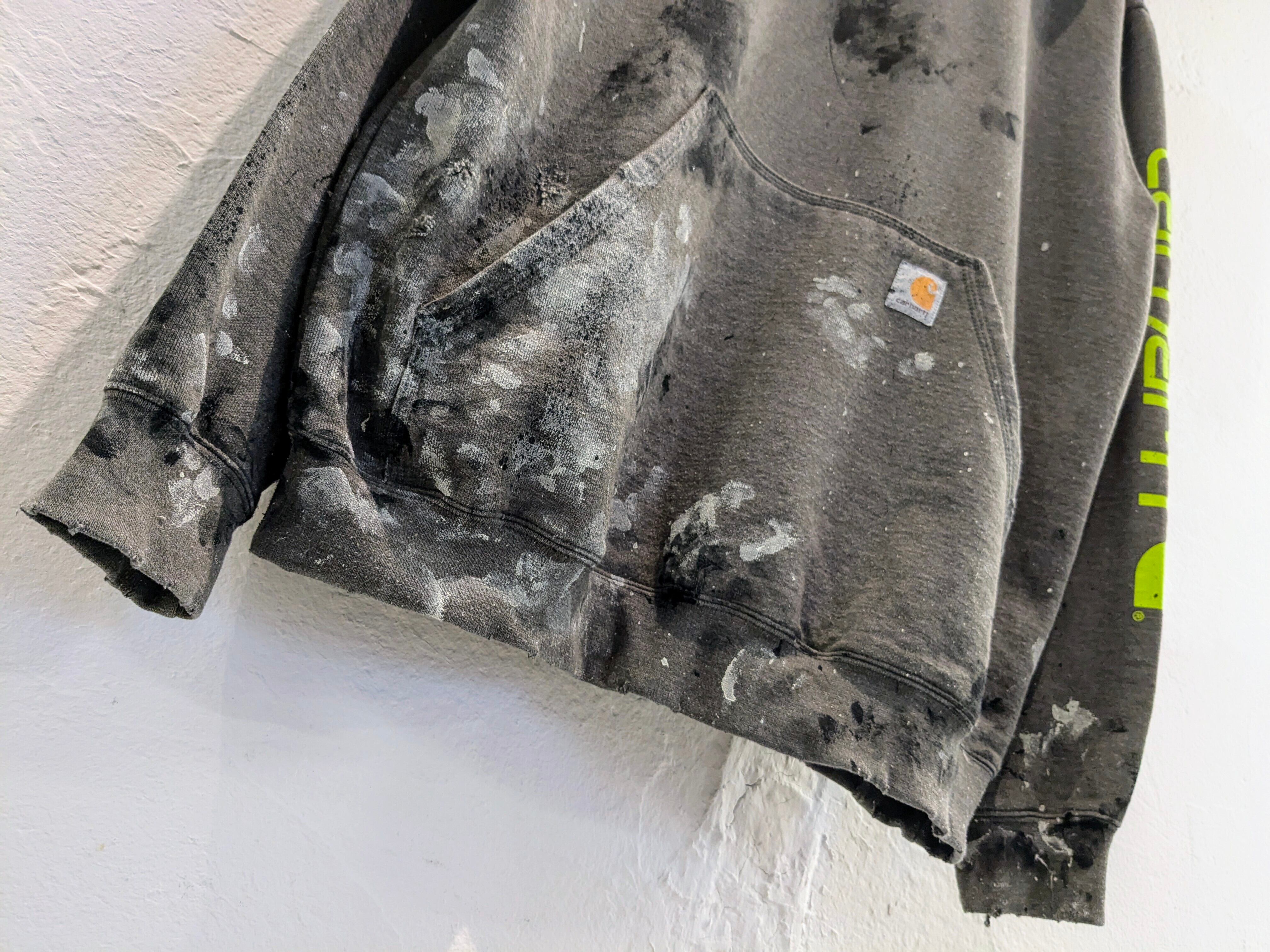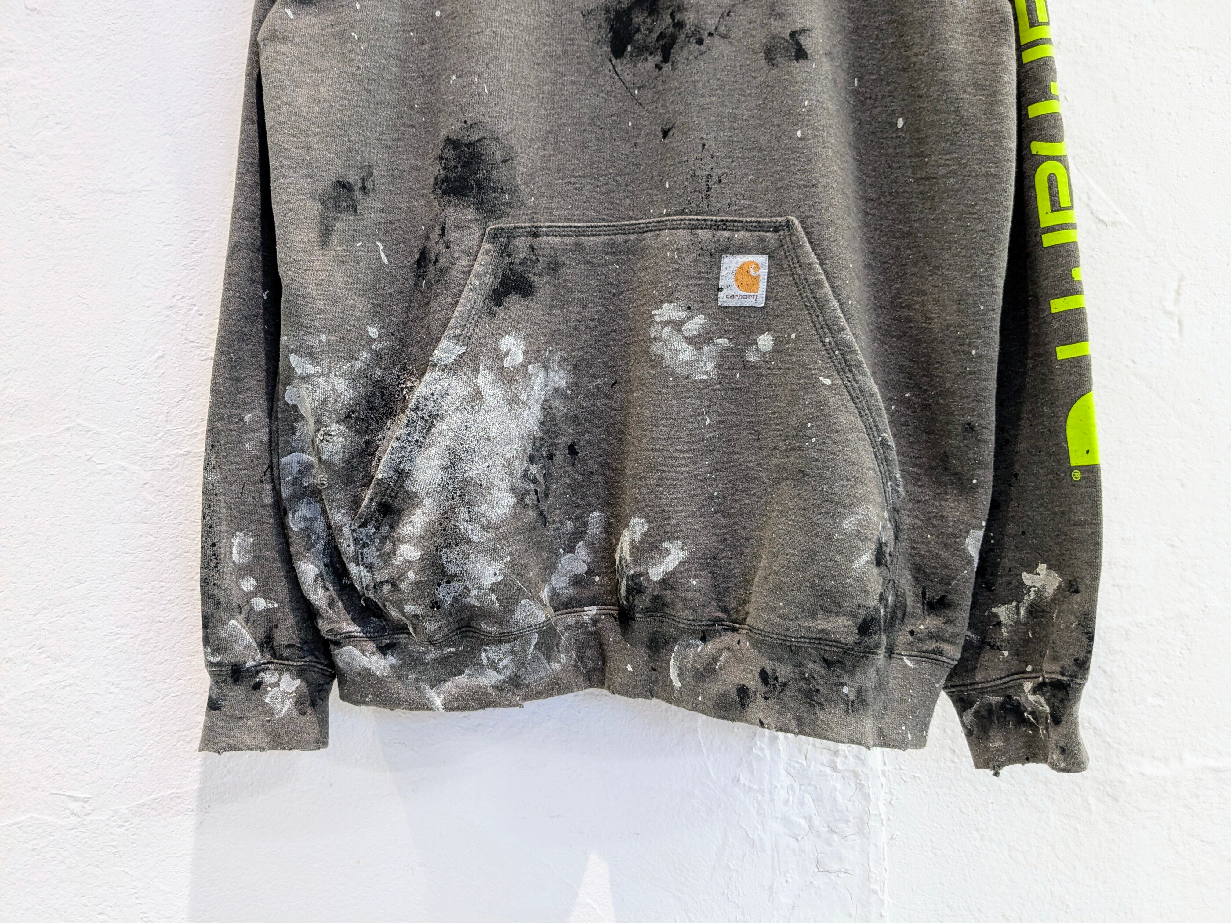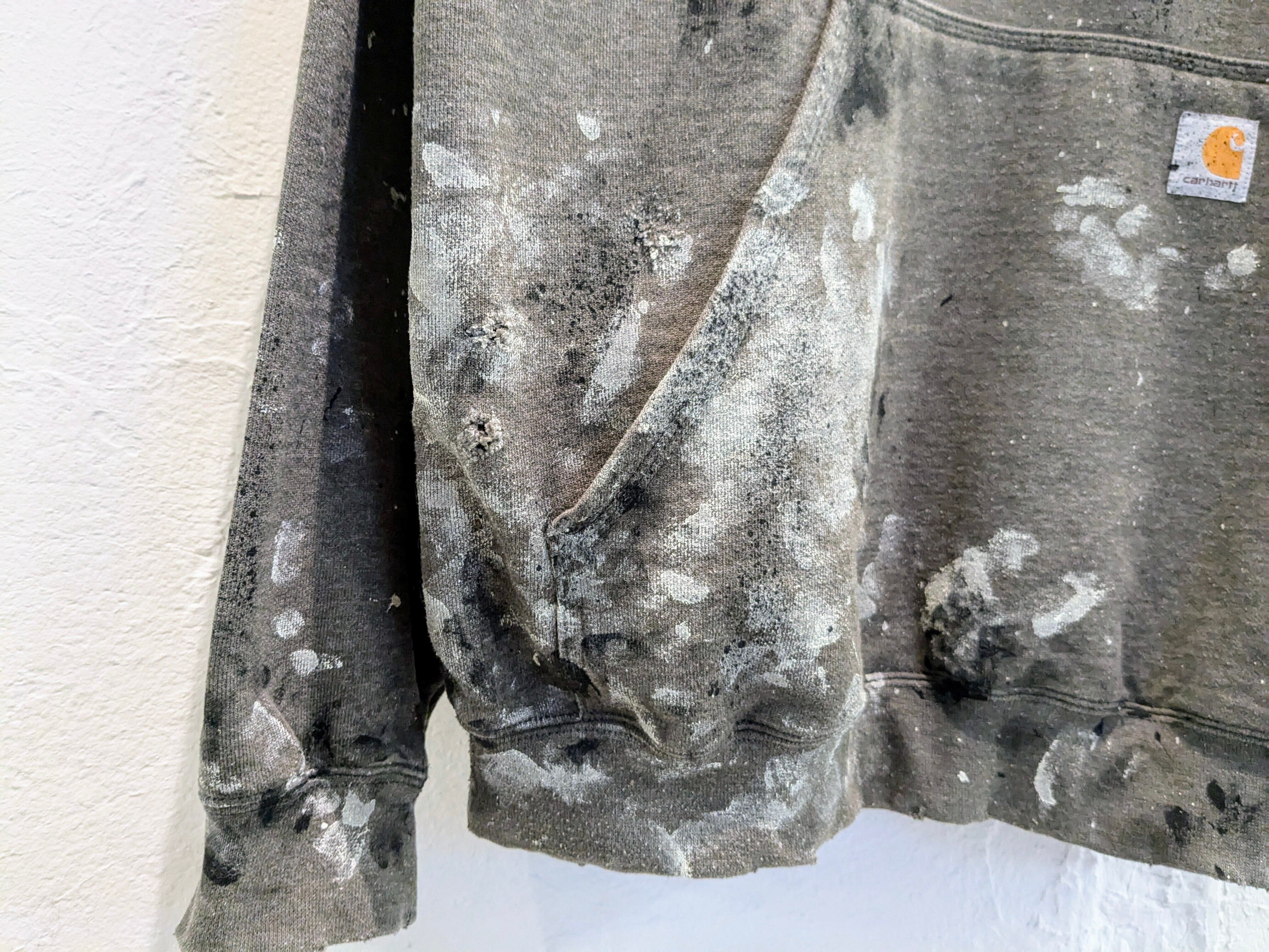 フェード、ダメージ、ペイントの加工を加えてもらった一着。グッドレギュラーのカーハートのパーカーを使用。