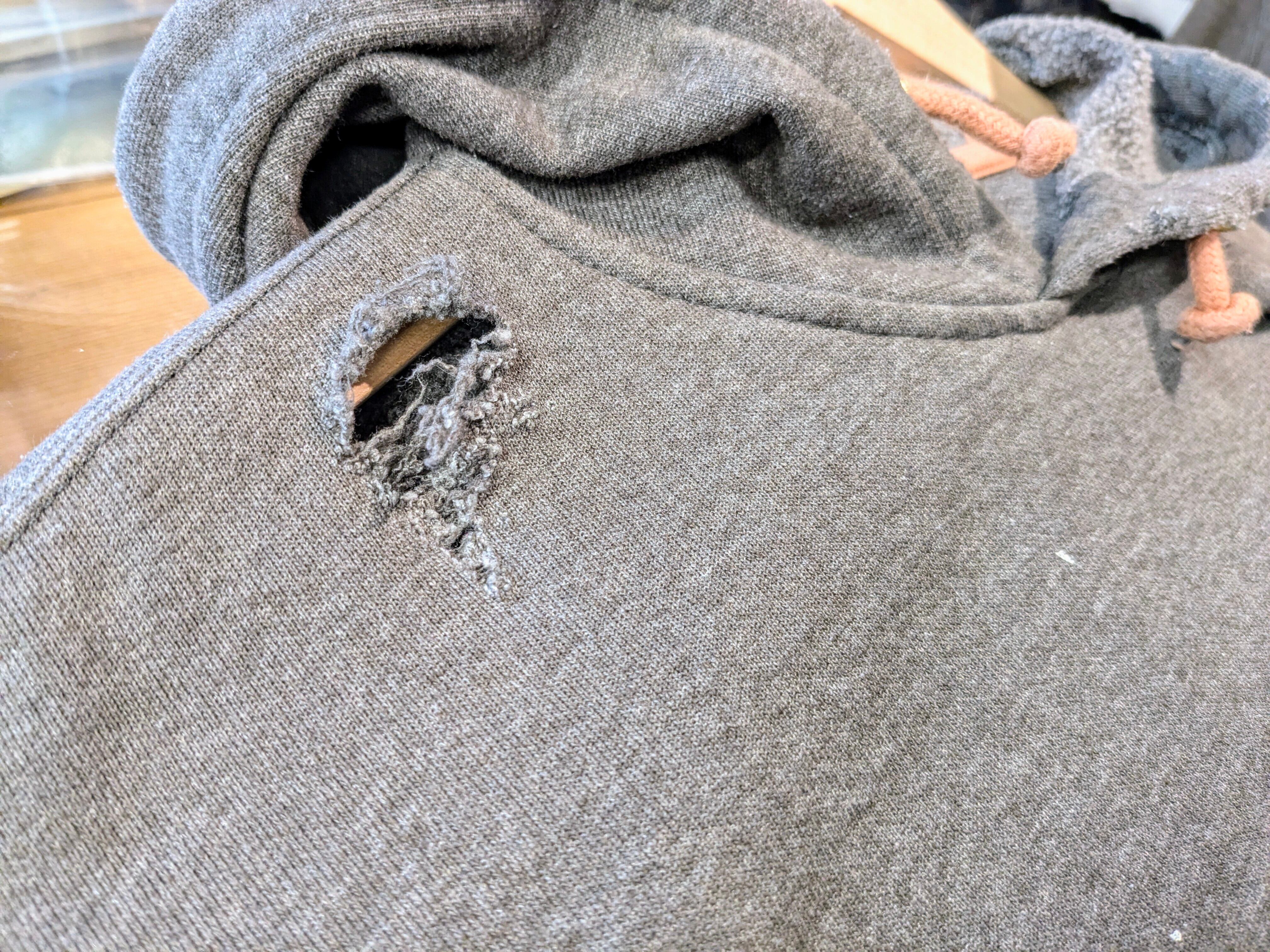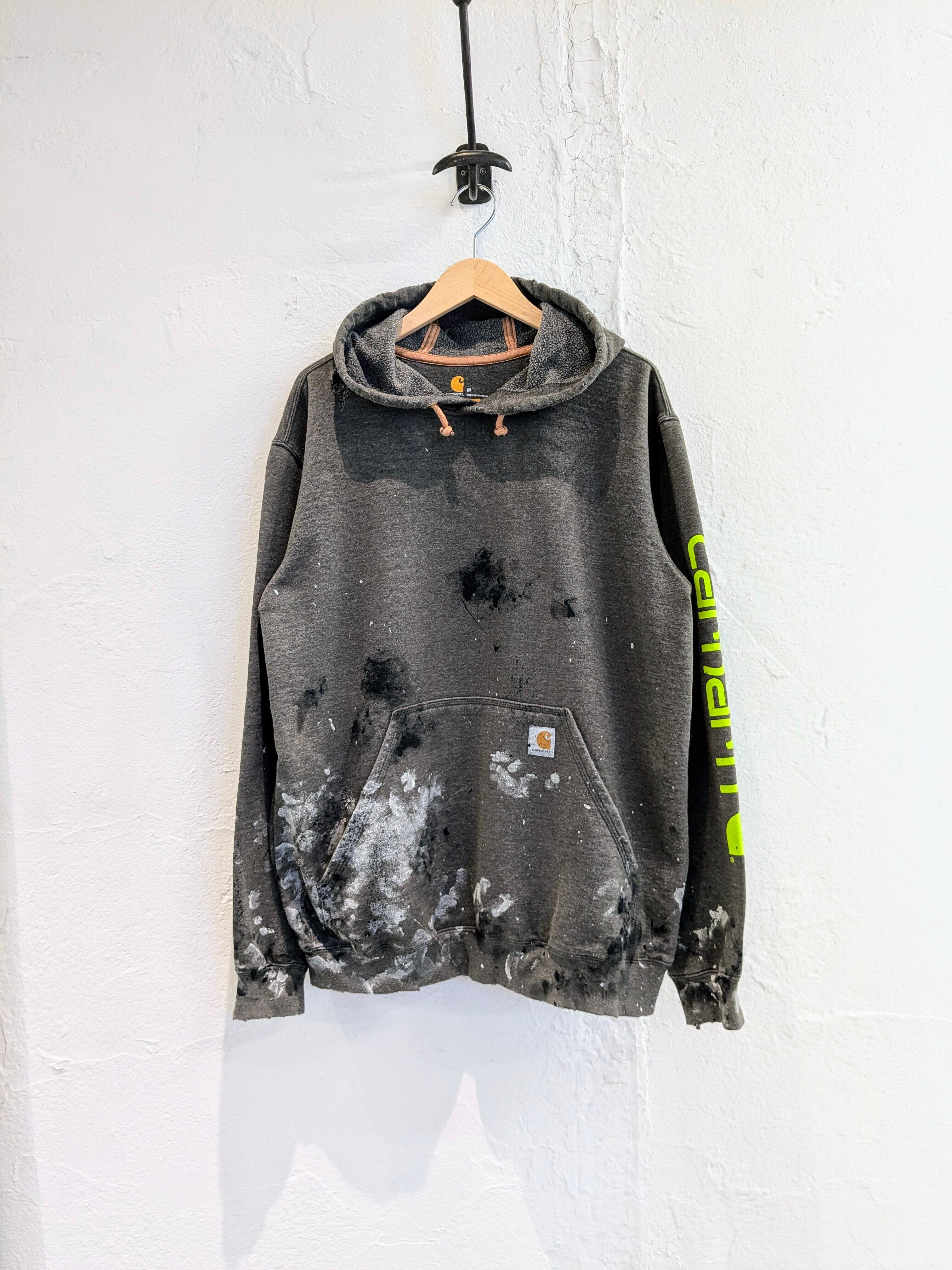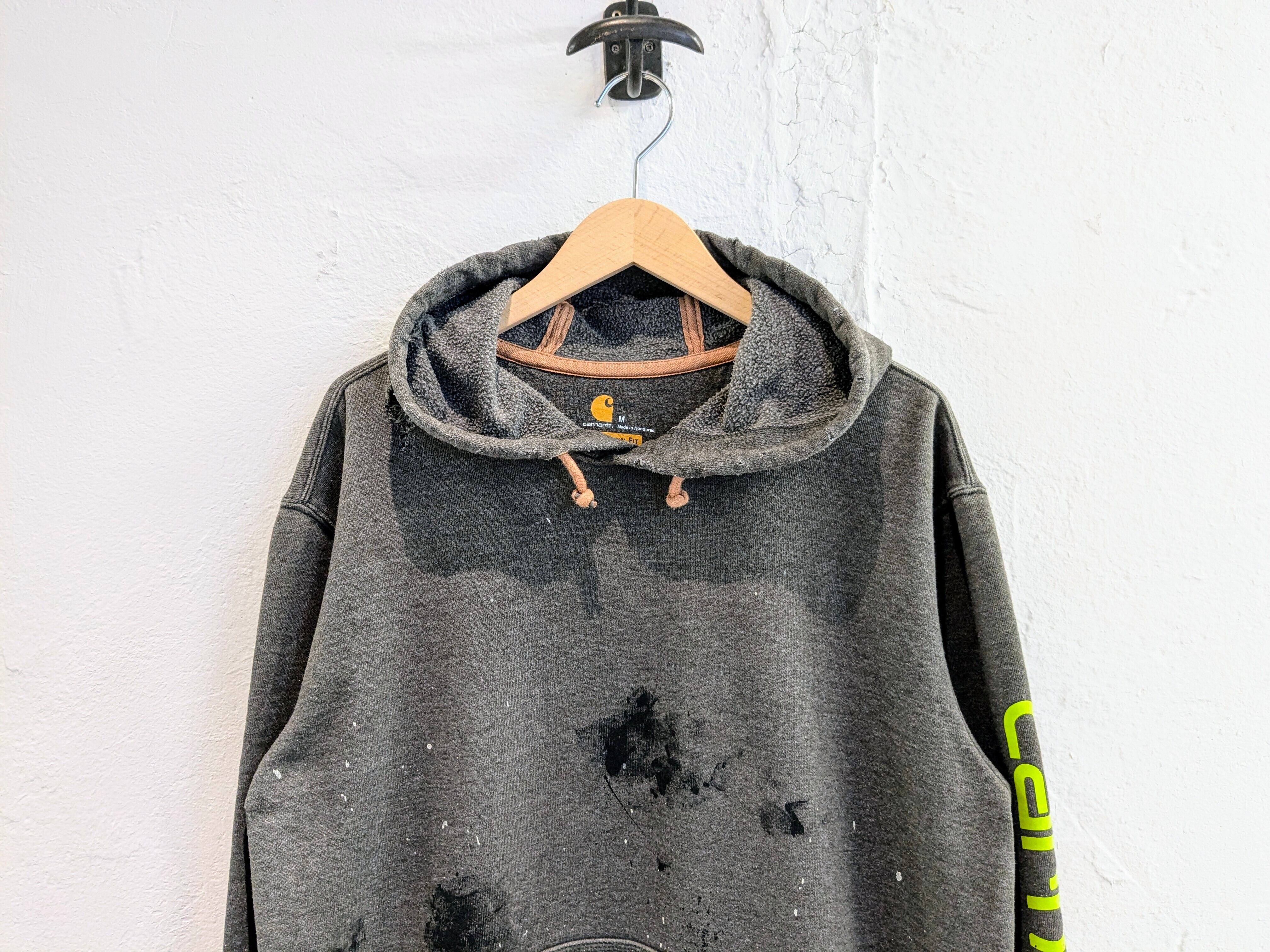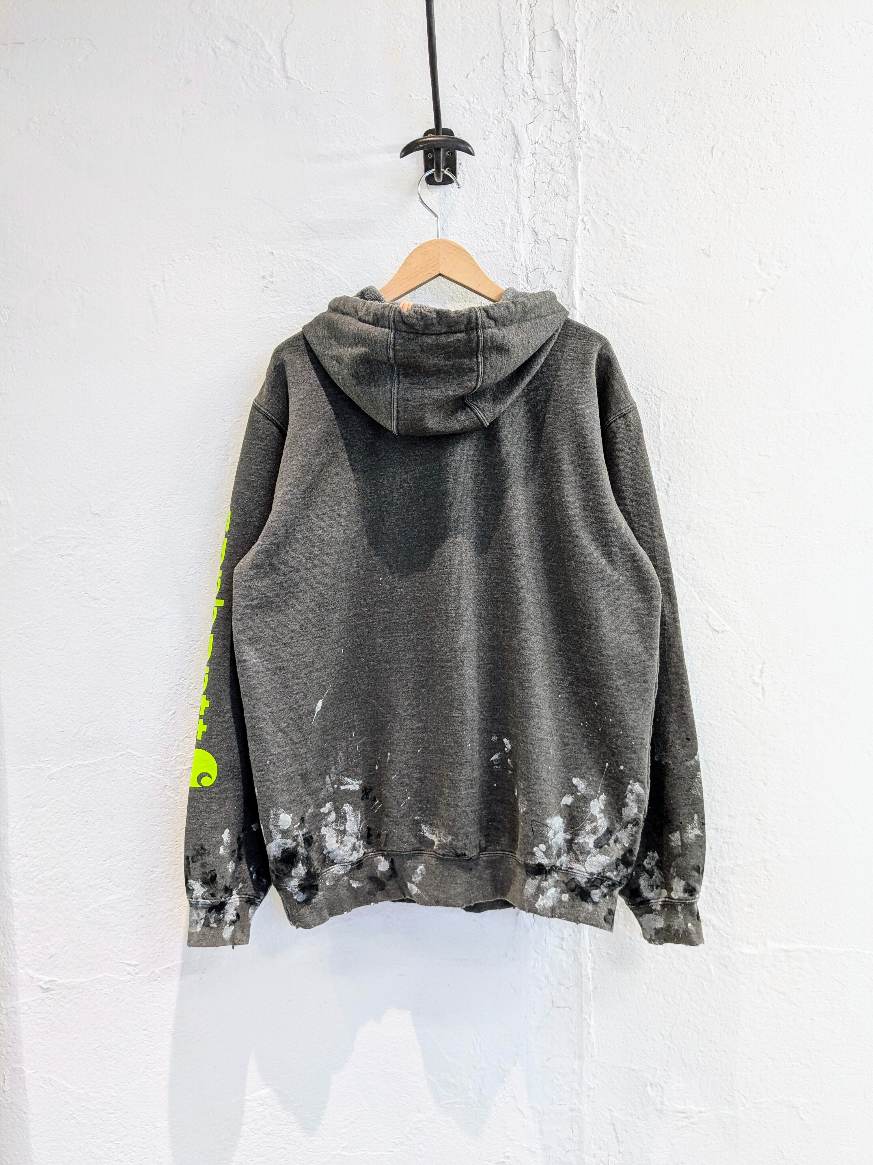 フェード、ダメージ、ペイントの加工を加えてもらった一着。グッドレギュラーのカーハートのパーカーを使用。