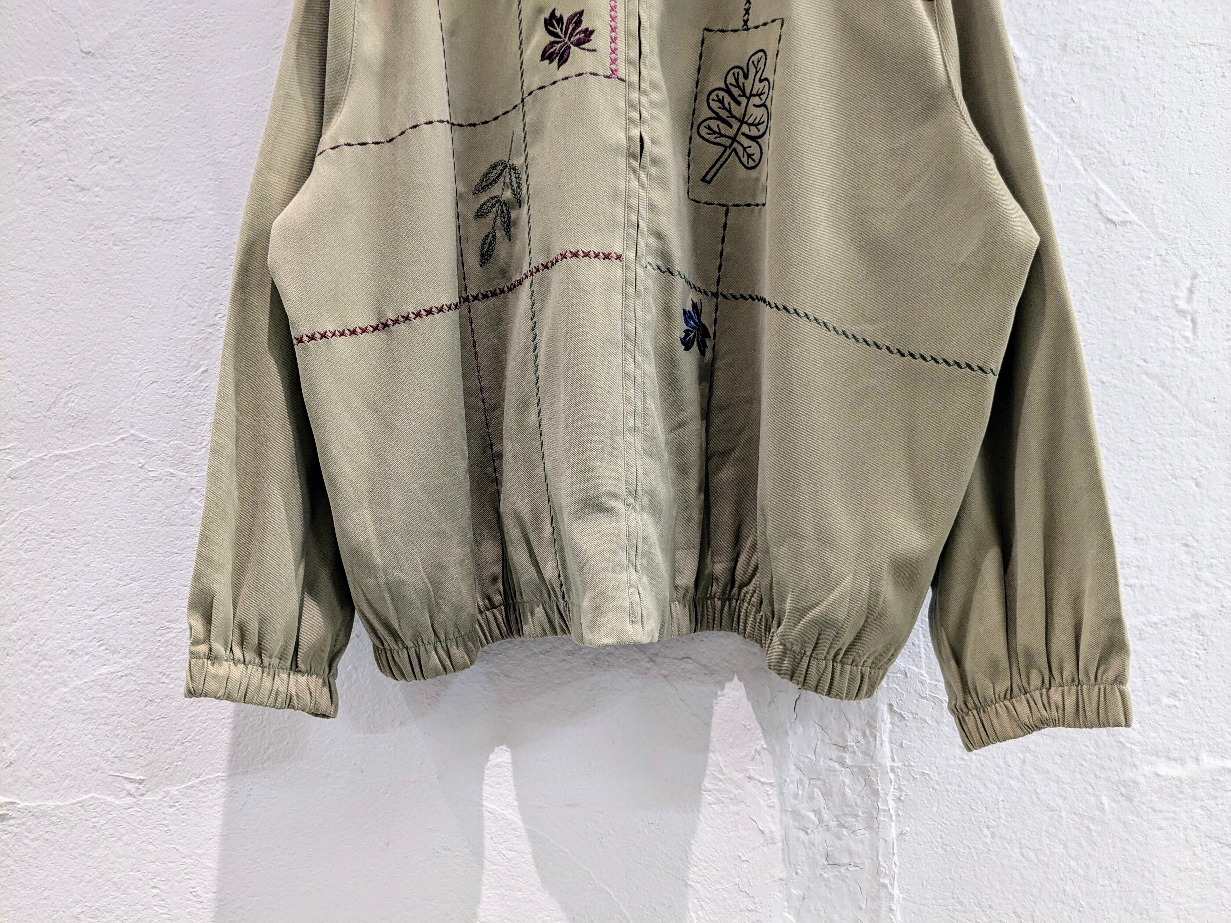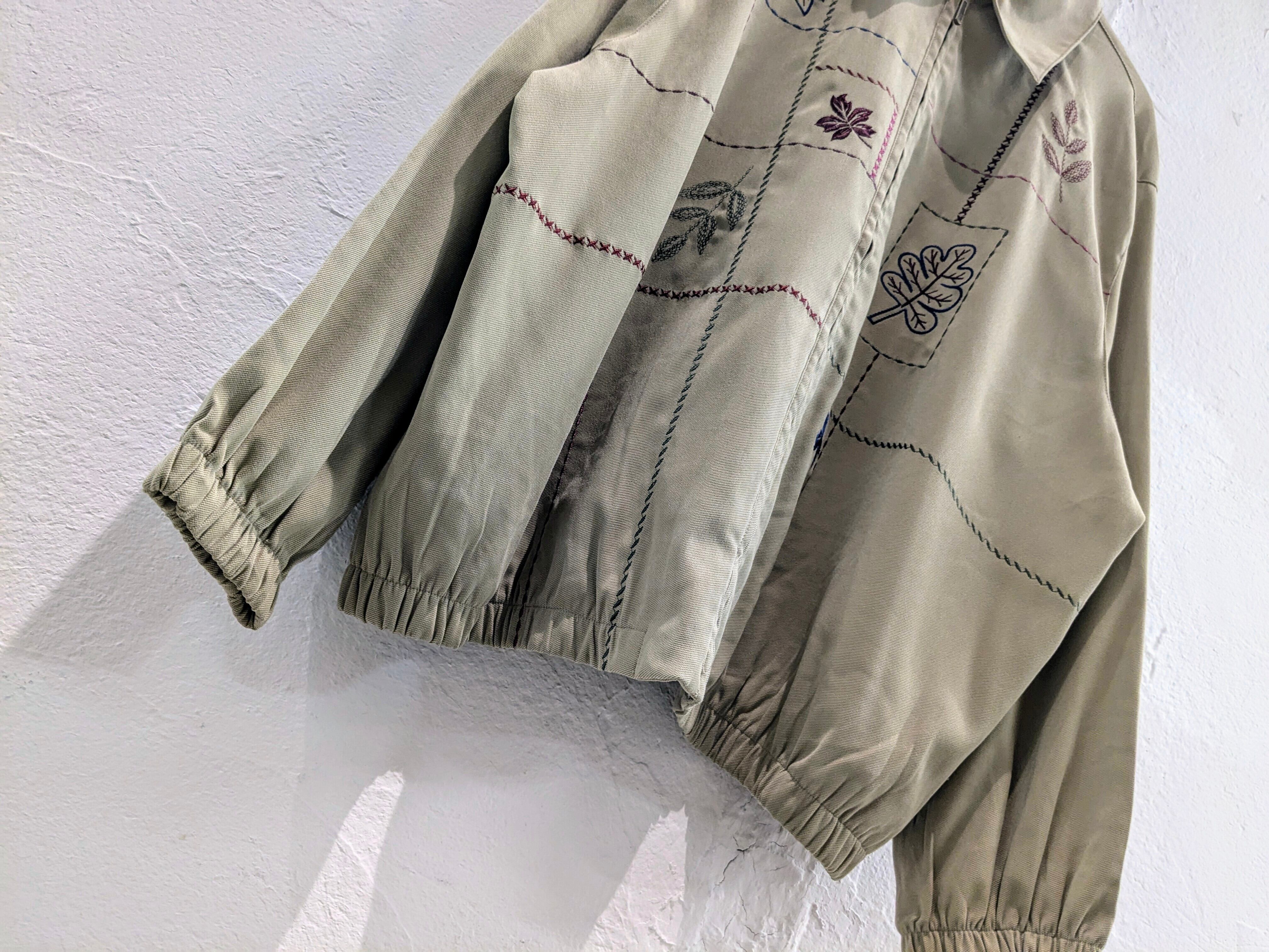 葉っぱ刺繍デザインのブルゾンになります。色んな種類の葉っぱが刺繍されているのと、多色でのステッチが目を引く一着。素材は、落ち感がある素材なので、サイズはゆったりとしているのですが、綺麗に着ていただけます。元々はレディースになるので、丈は短めになっているので、着たときのバランスがとても綺麗です。メンズ、レディース共にオススメのアイテムとなっています。