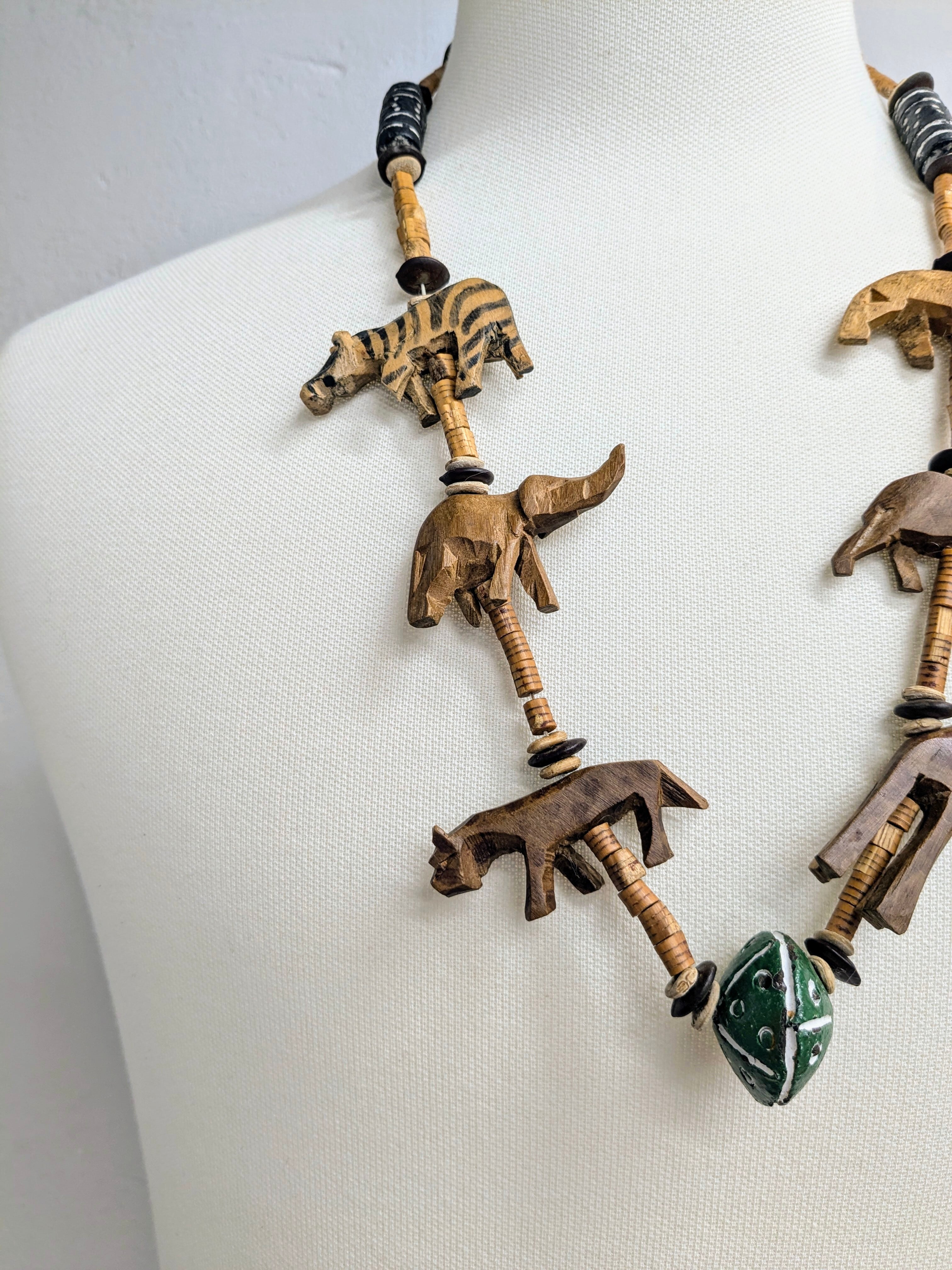 象、キリン、ライオンなどアニマルモチーフのついたウッド調のネックレスとなります。シンプルな服装の時に付けると一気にオシャレ感が増すアイテム。
