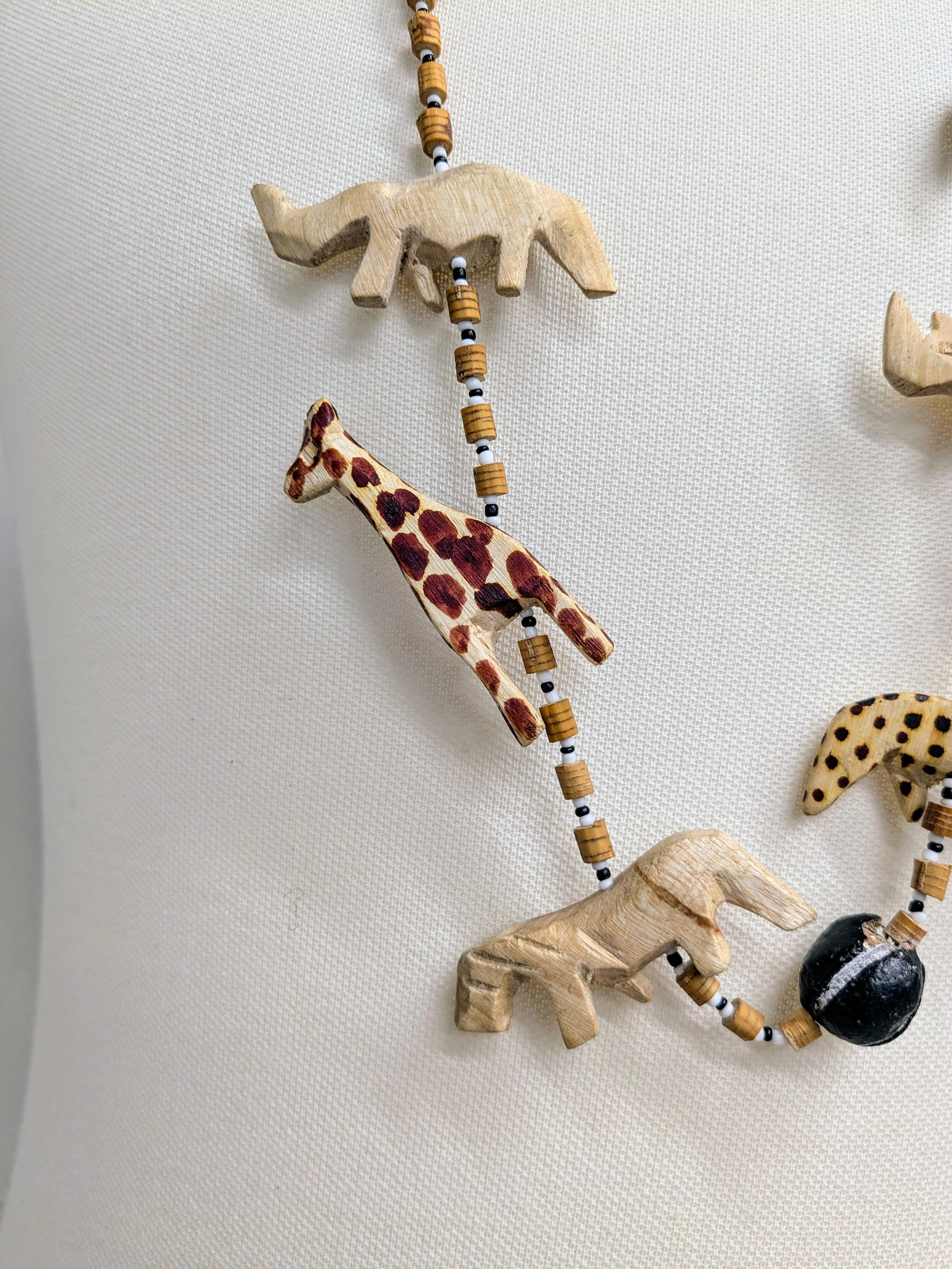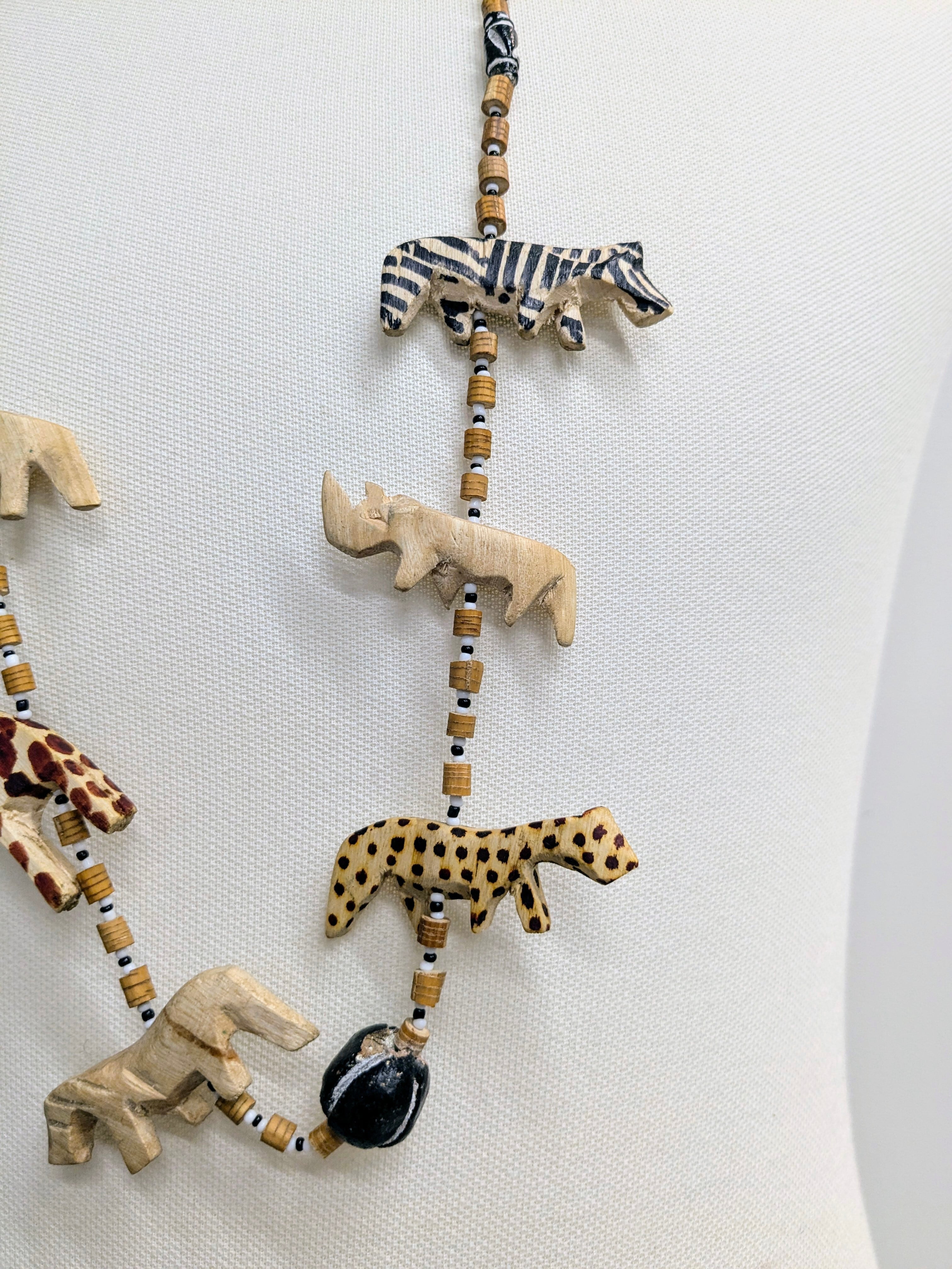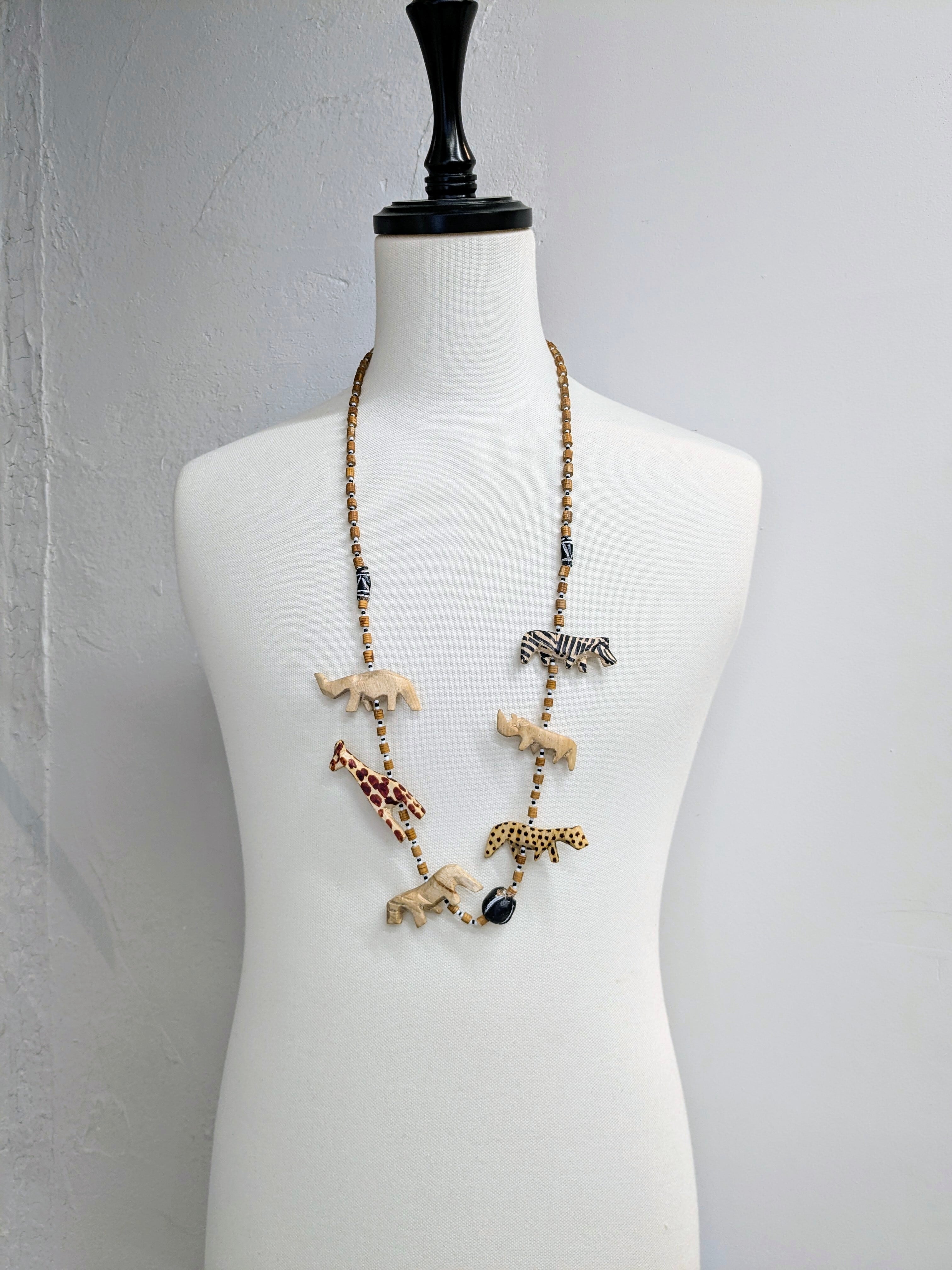 ヒョウ、キリン、シマウマなどアニマルモチーフのついたウッド調のネックレスとなります。シンプルな服装の時に付けると一気にオシャレ感が増すアイテム。