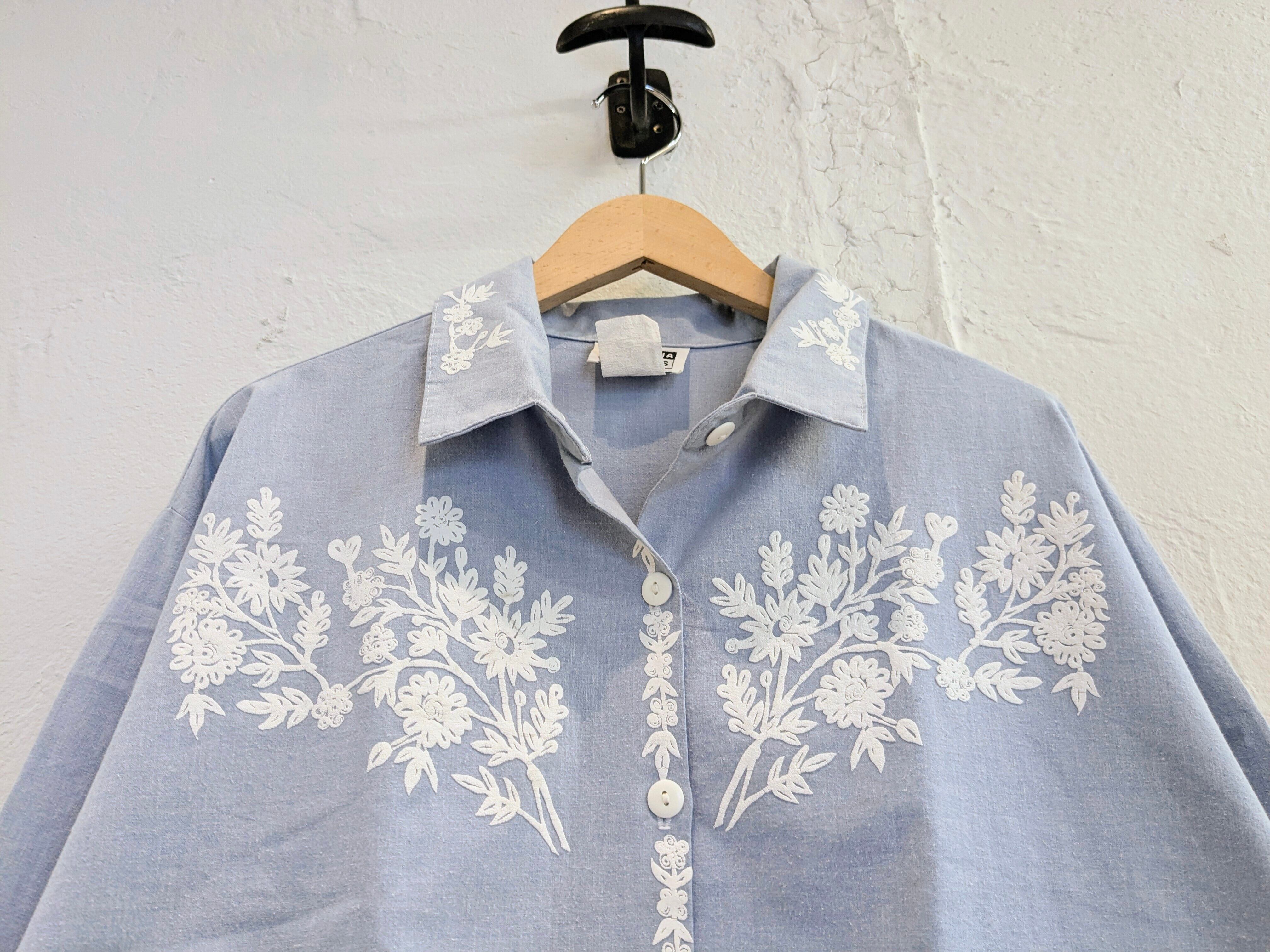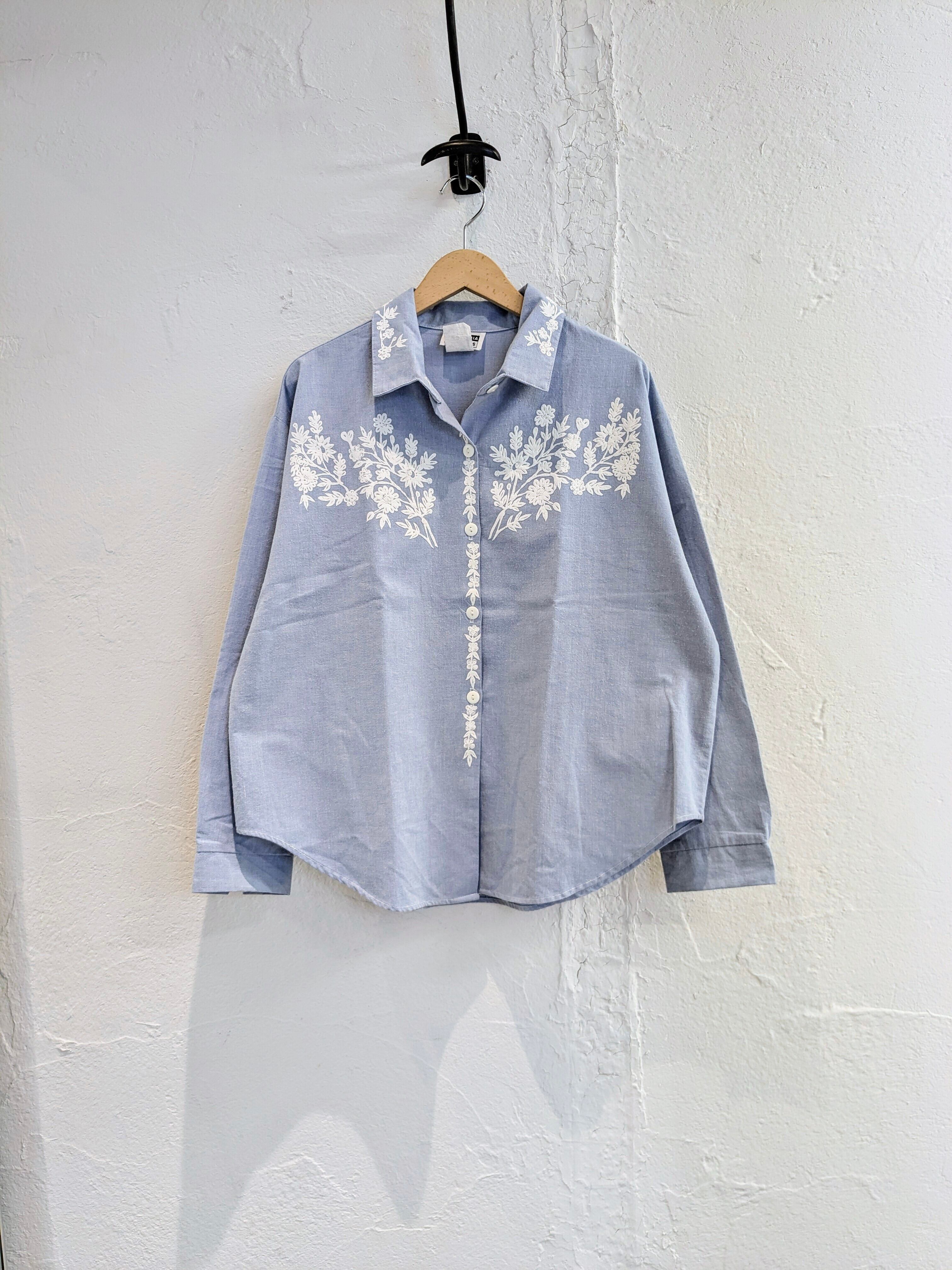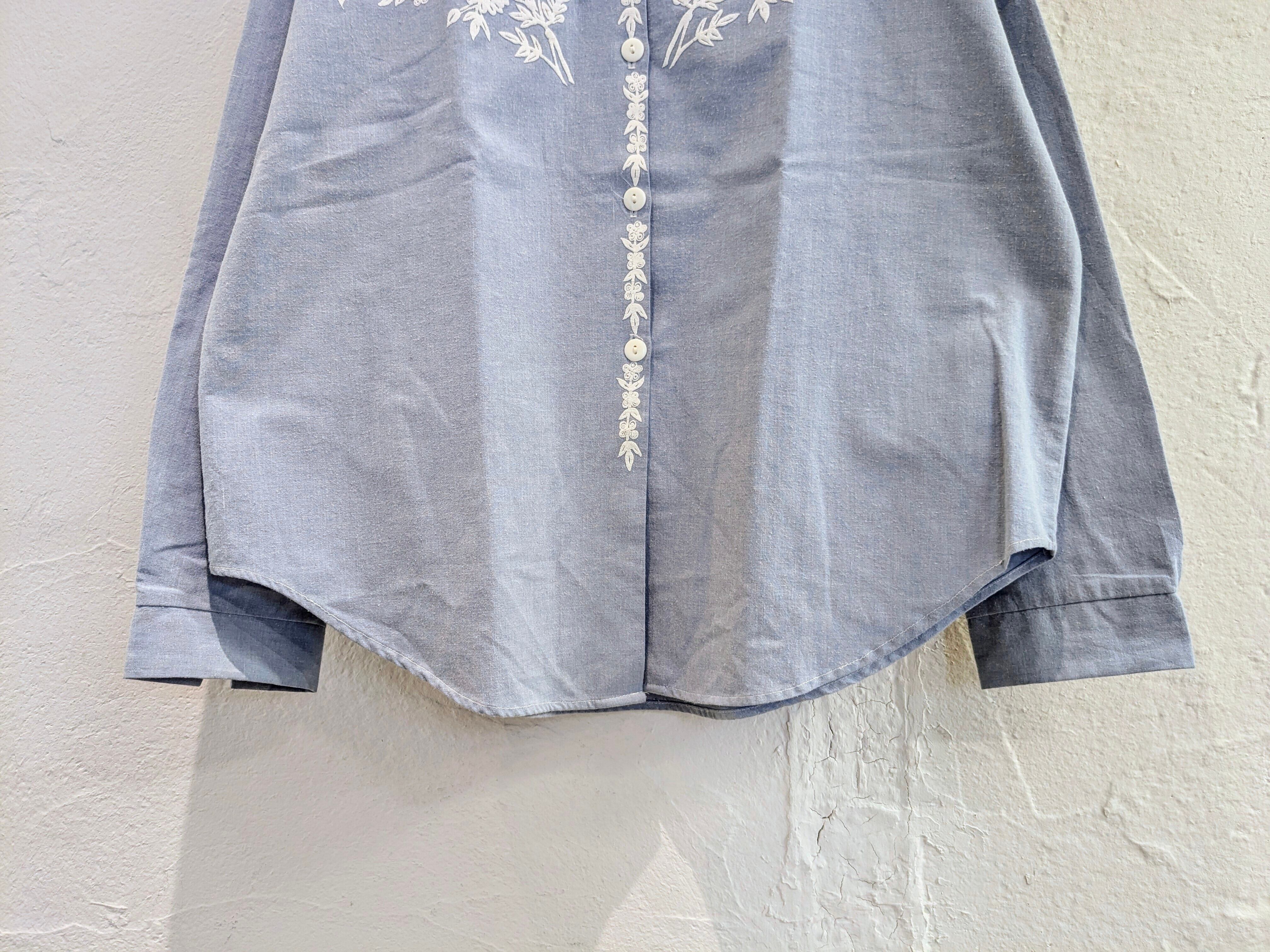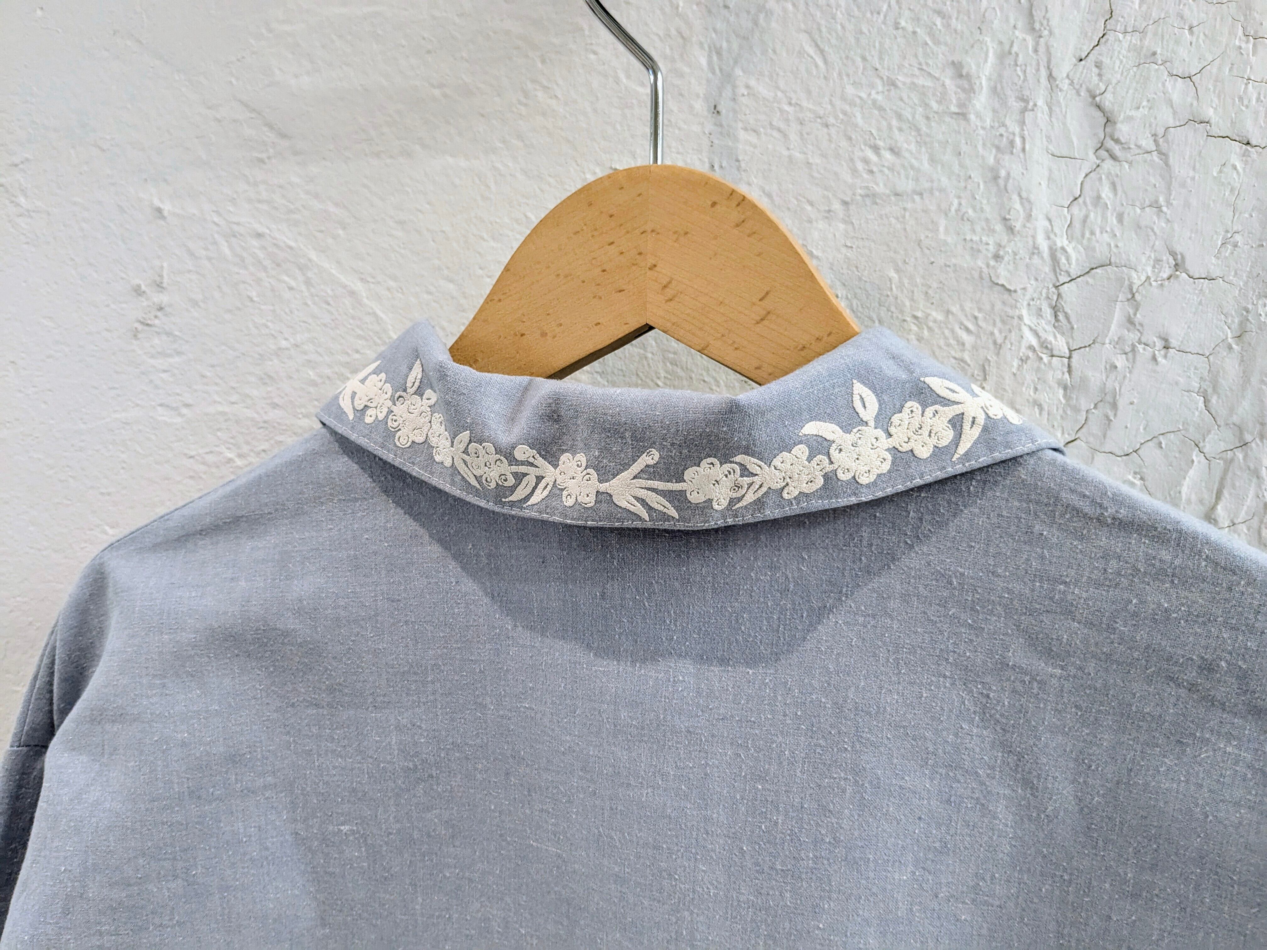 刺繍では比較的目にすることは多いかと思いますが、こういったデザインは珍しいかと。生地は柔らかいオックスフォードのシャツ。全体的に杢がかった色味がまた綺麗な一着。短丈のワイドなシルエットがまたちょうどいいアイテムかと。