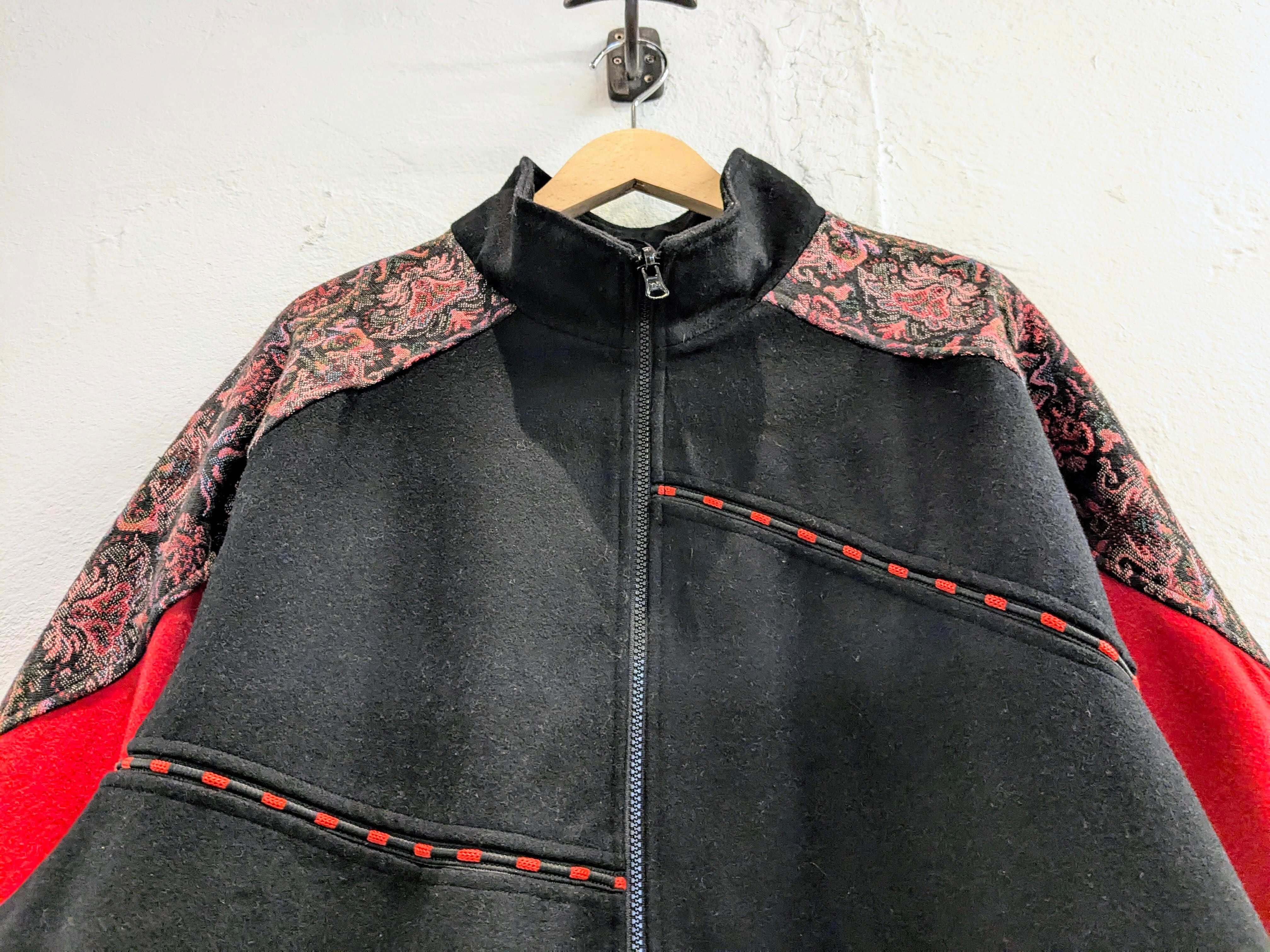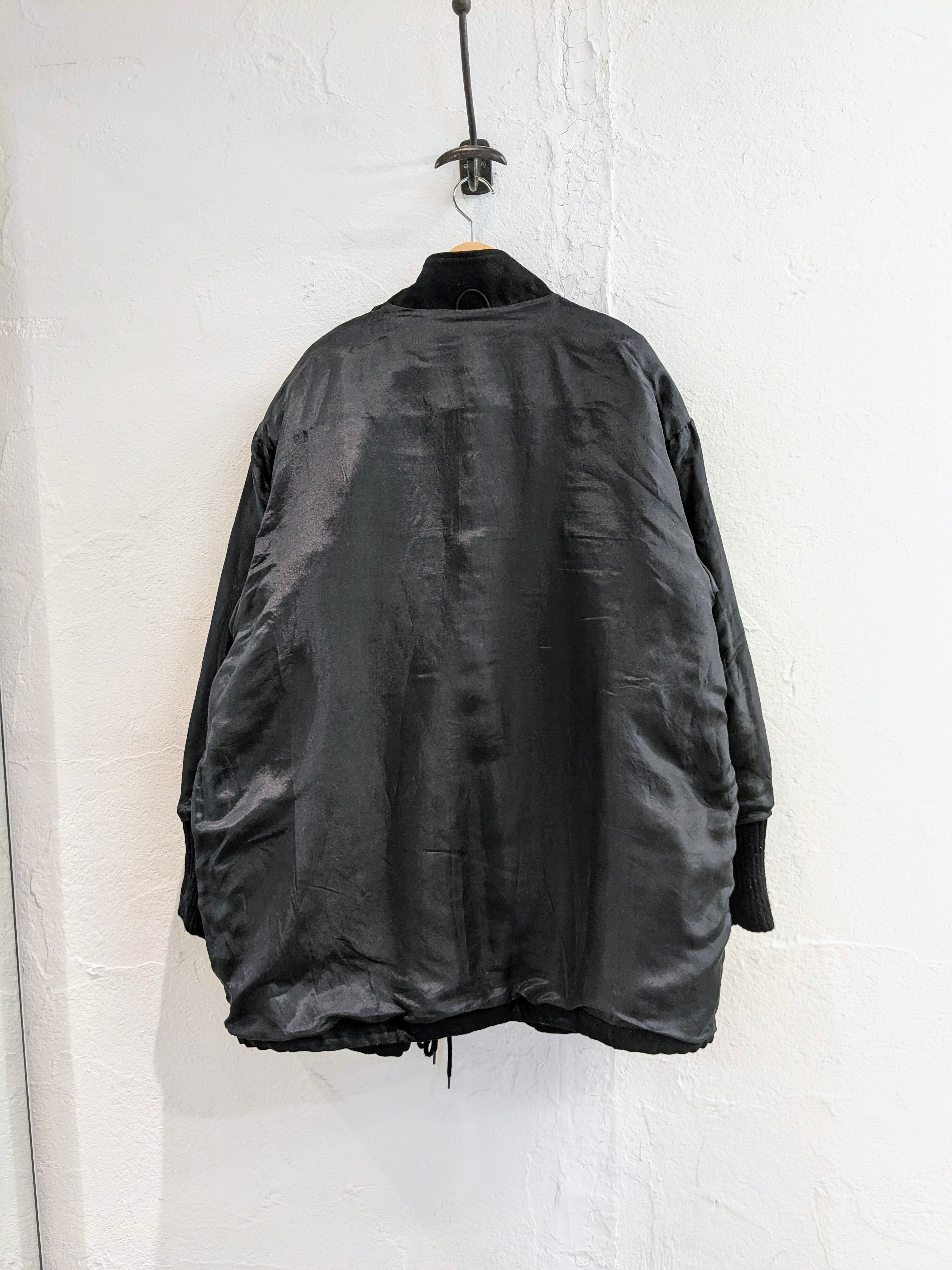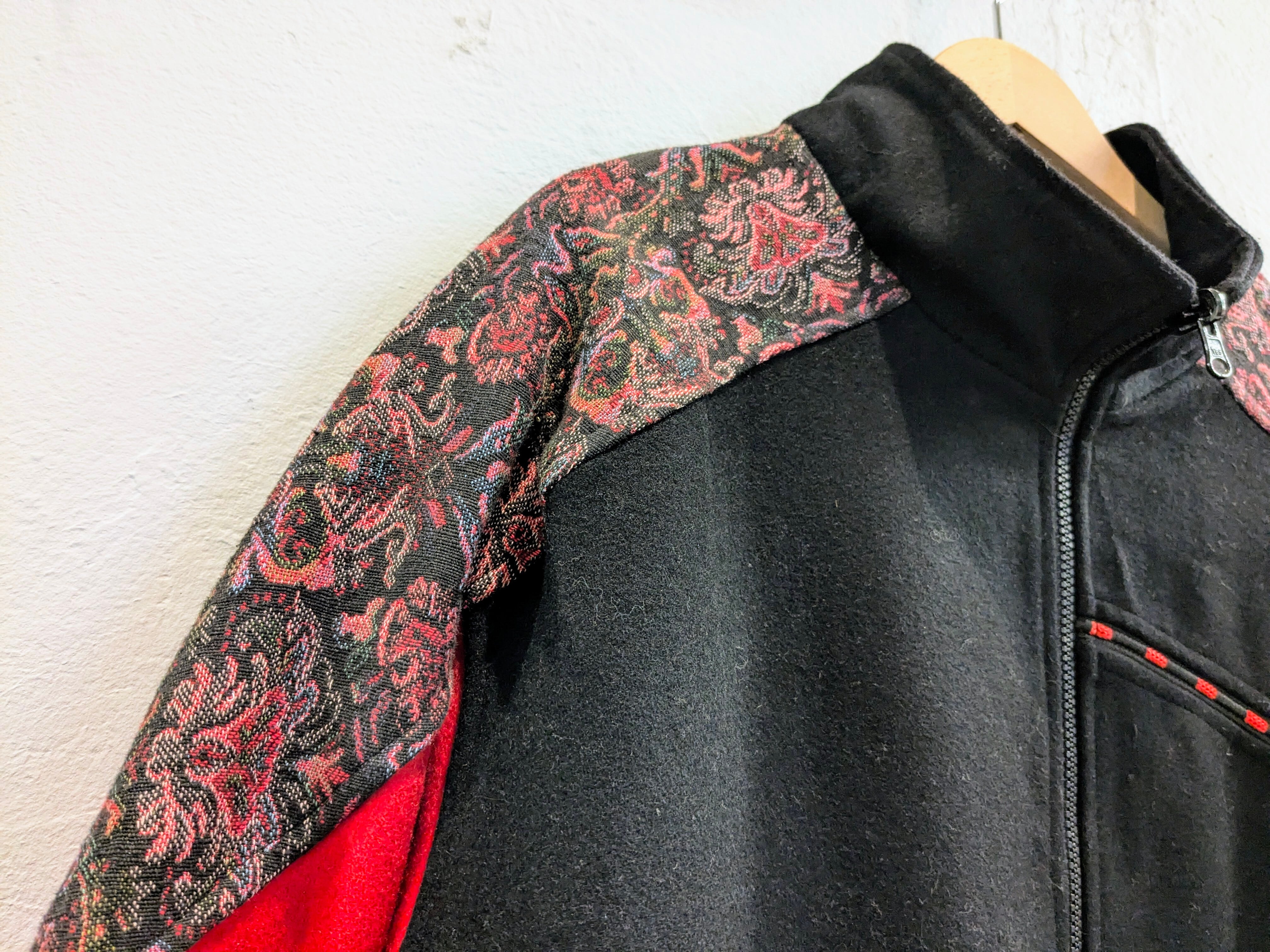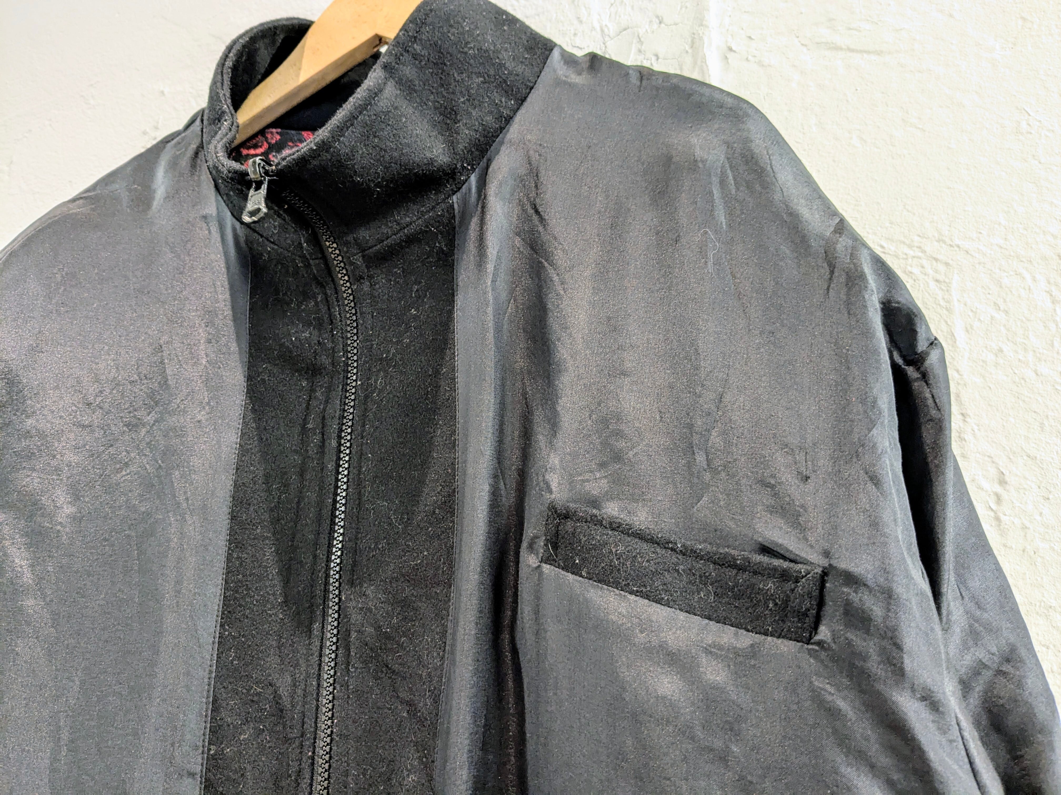 サイドAの方は、花柄のようなゴブラン生地が付いており、コードが付いたようなデザインなどが特徴的なアイテム。タイプBは、ガラッと表情が変わりブラックのシンプルなデザイン。ただ、素材がシルクをしようしており、しっとりとした光沢のある素材となり、とても上品、綺麗な面感になっています。A.B関係なく、もはや両A面なブルゾン。サイズ的にはインナーも選ばず、ざっくりと羽織っていただけます。
