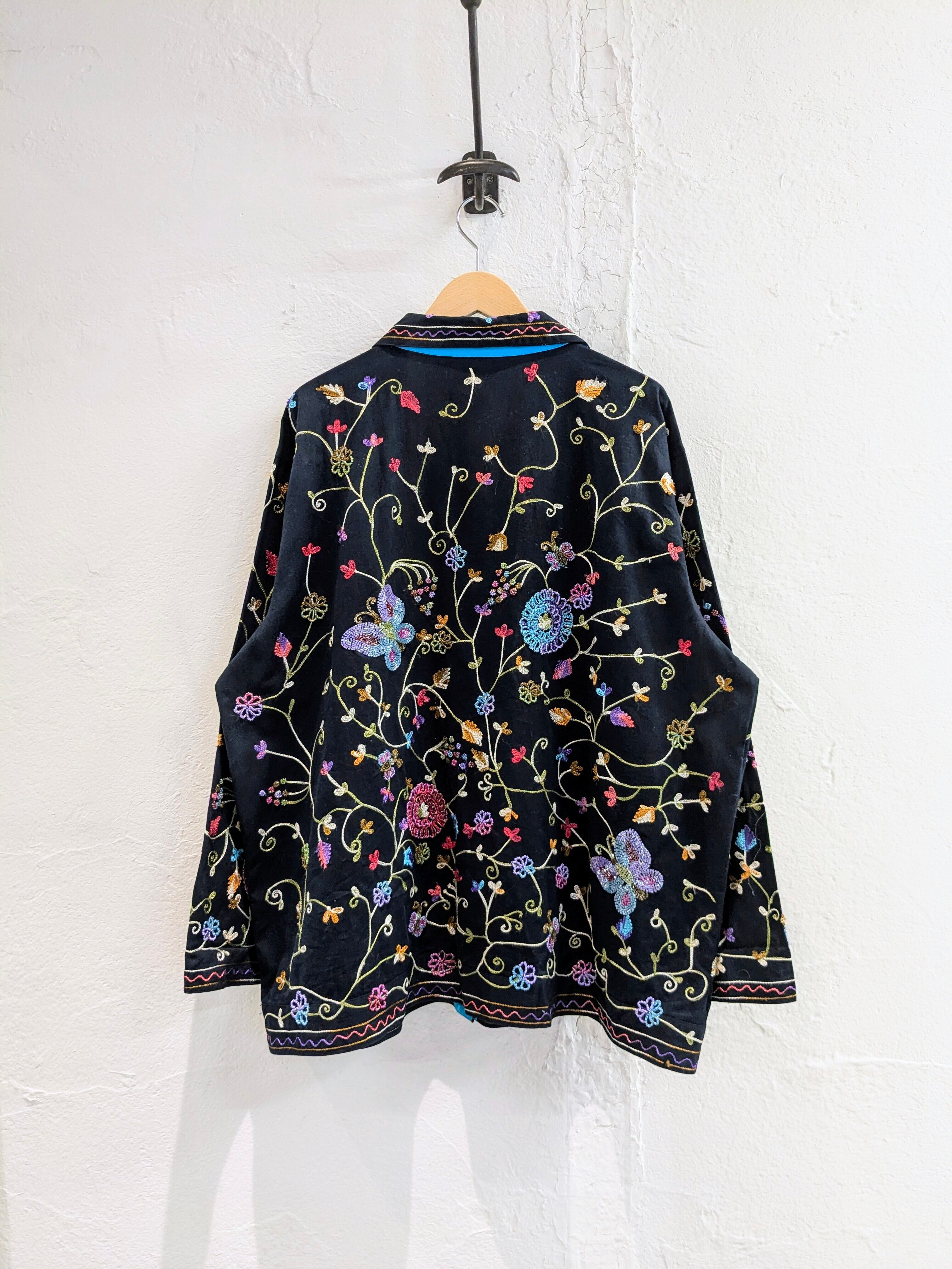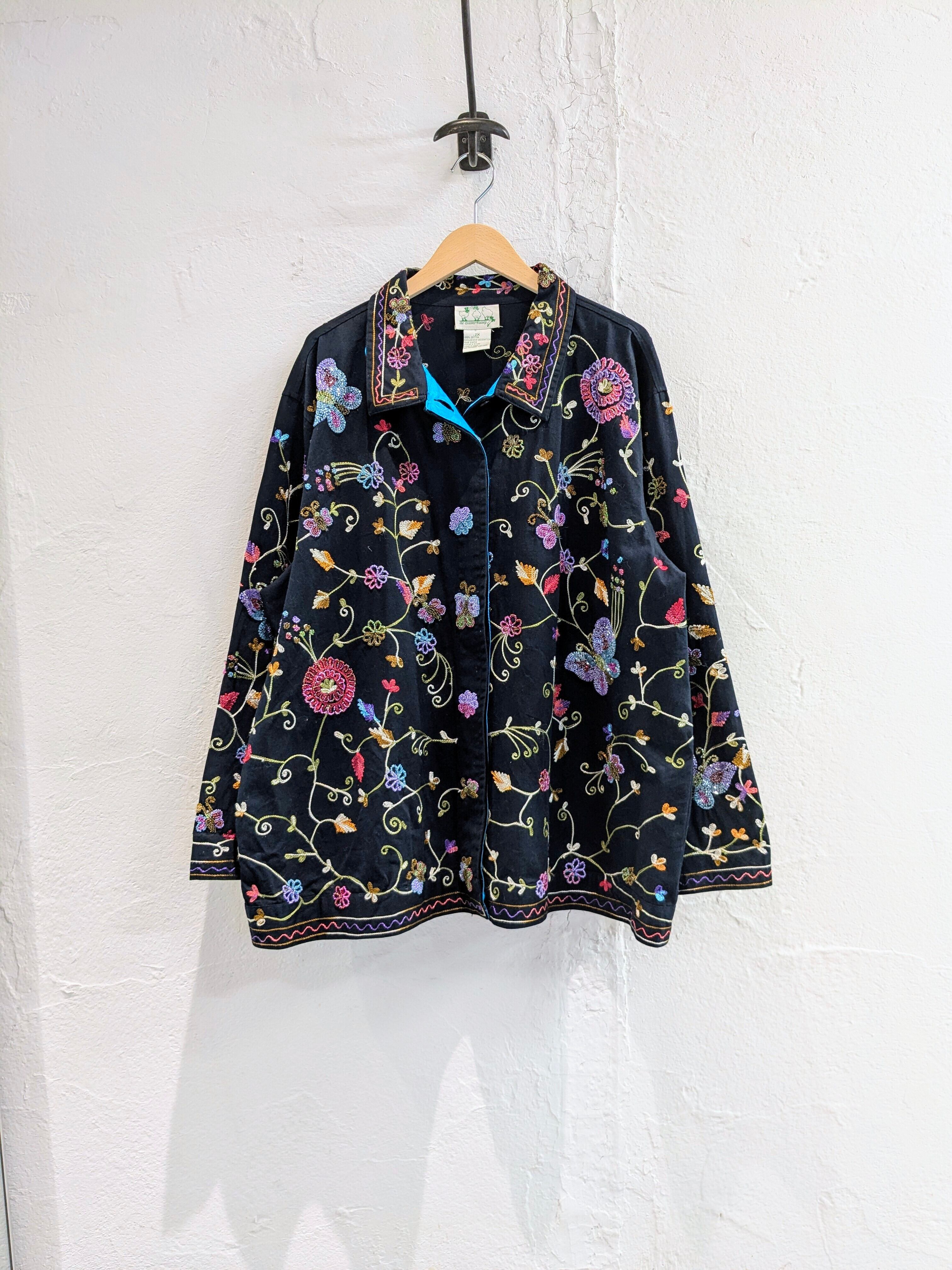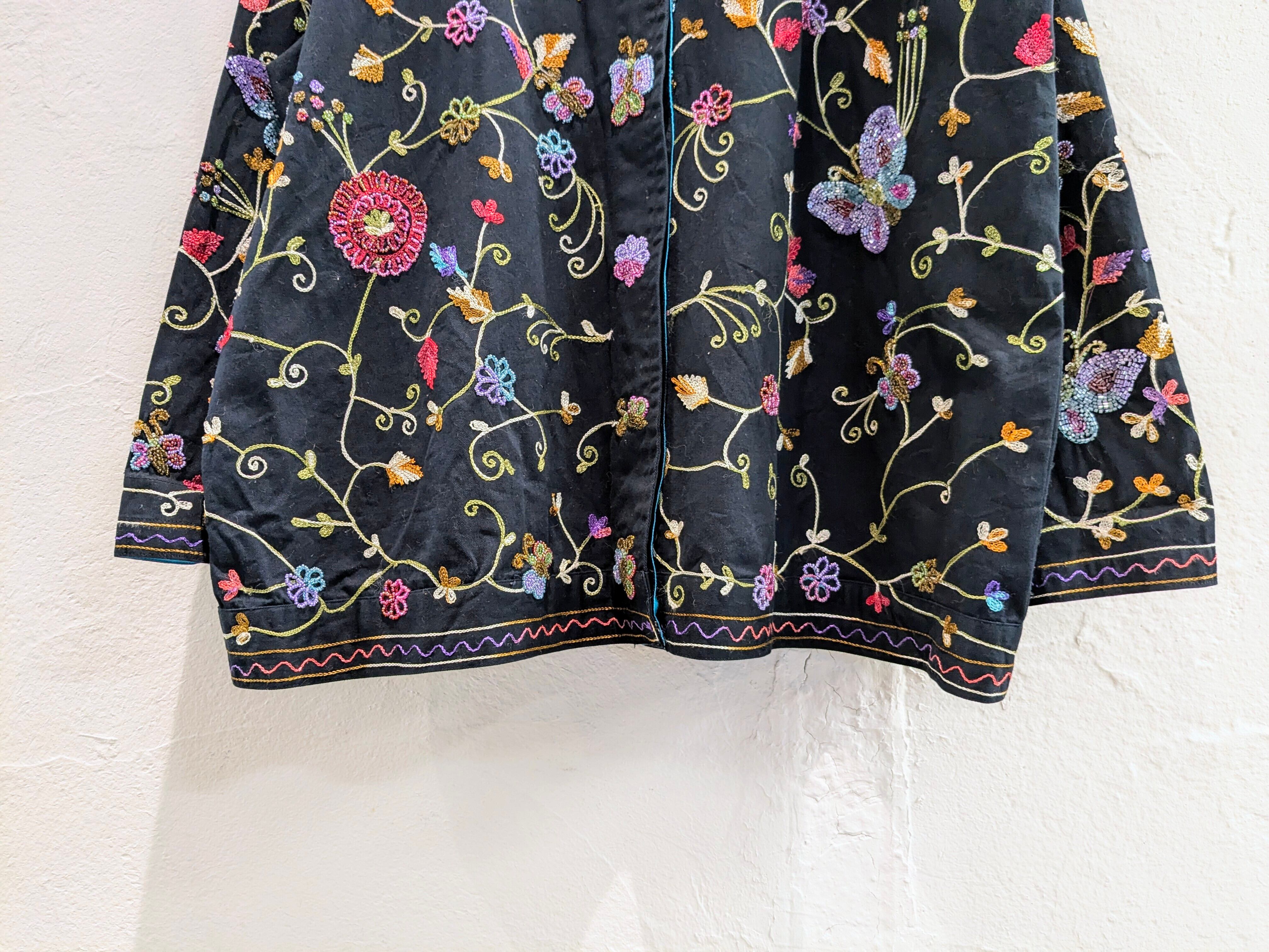 刺繍、ビーズのデザインがとにかく繊細で色使いも可愛く、細かい作業がされているアイテム。サイズもかなりゆったりとしているのでなかにスウェットなども着込むことができますし、シャツのような生地感になるので、上にオーバーサイズのアウターなども合わせられます。もちろん暖かい時期は、Tシャツ、タンクトップと合わせてもいいかと。