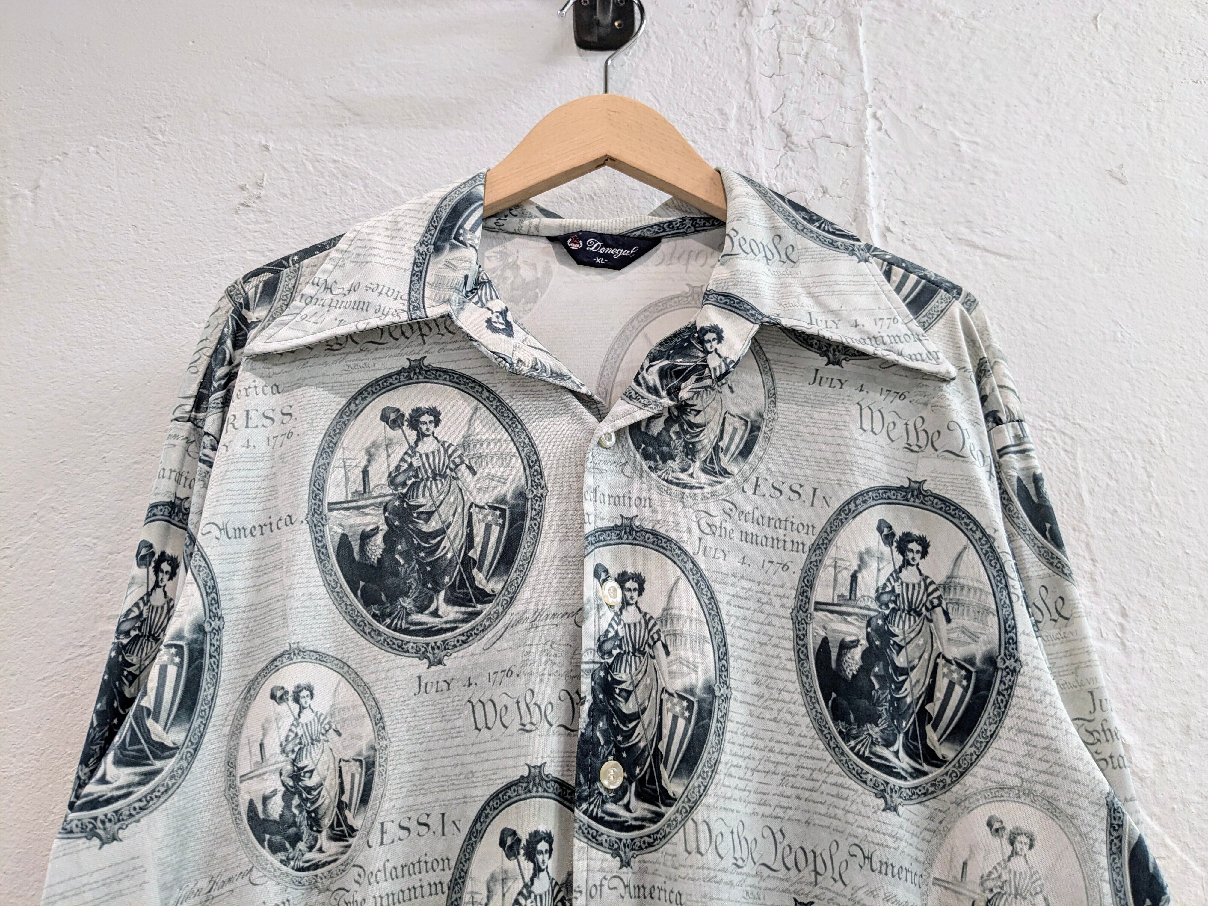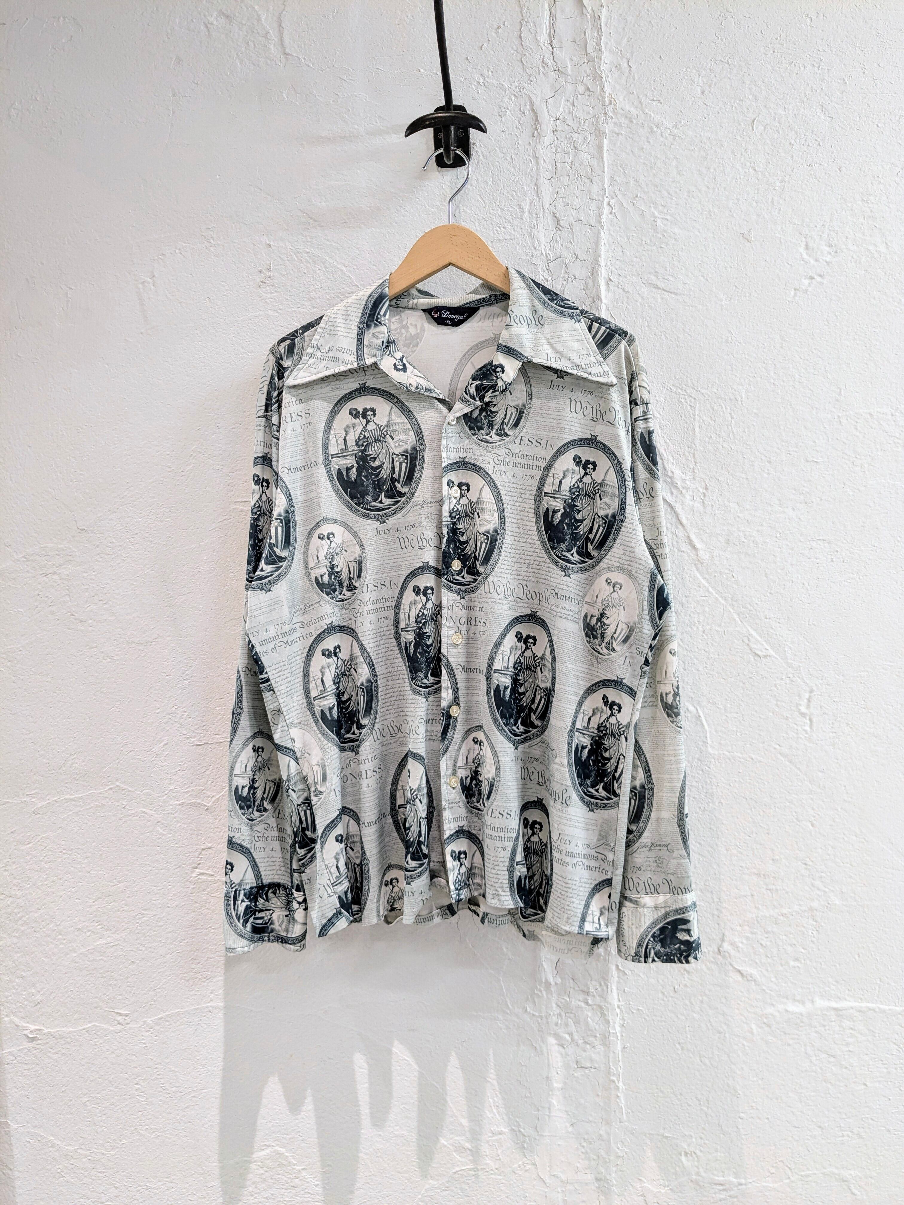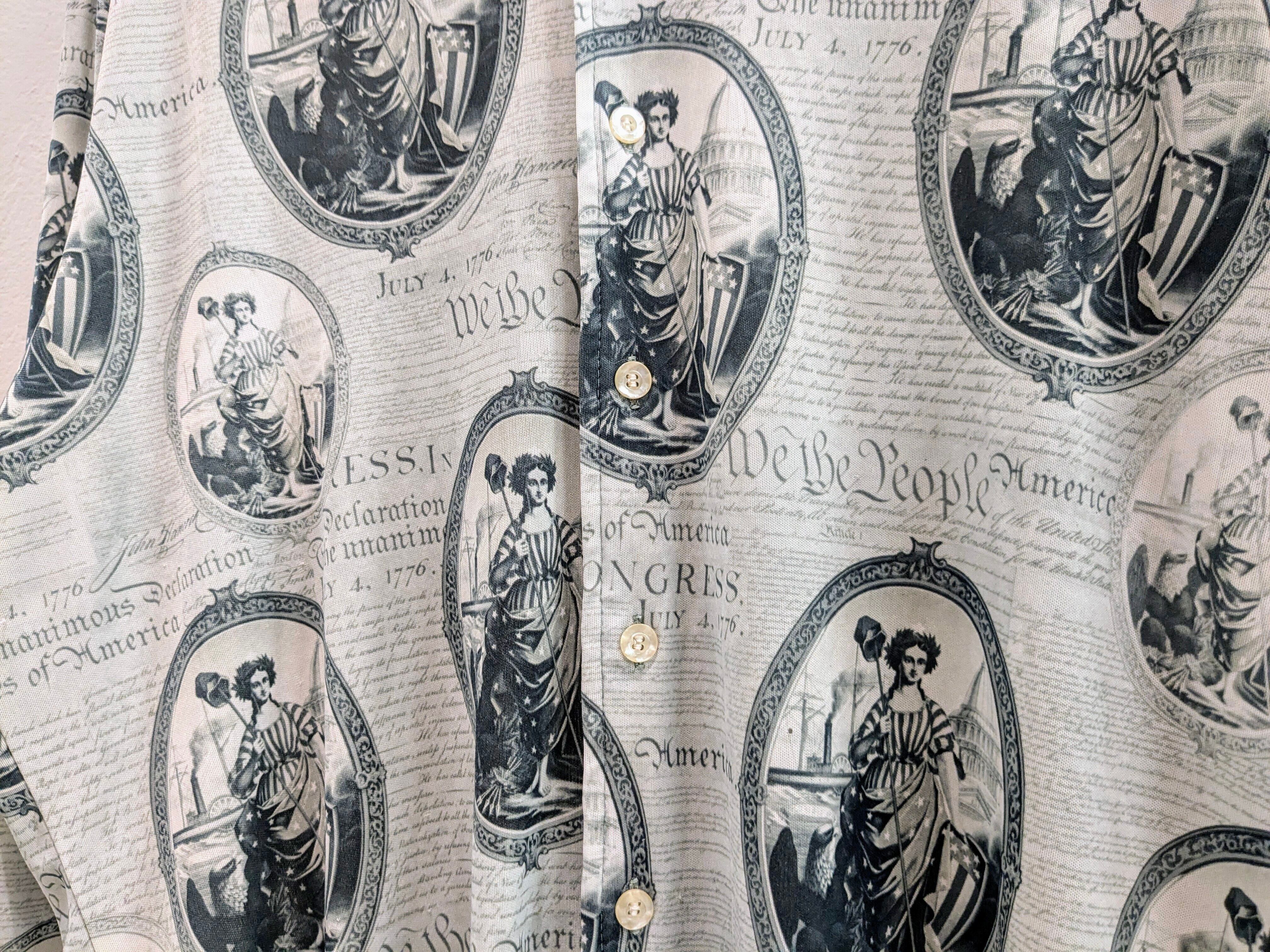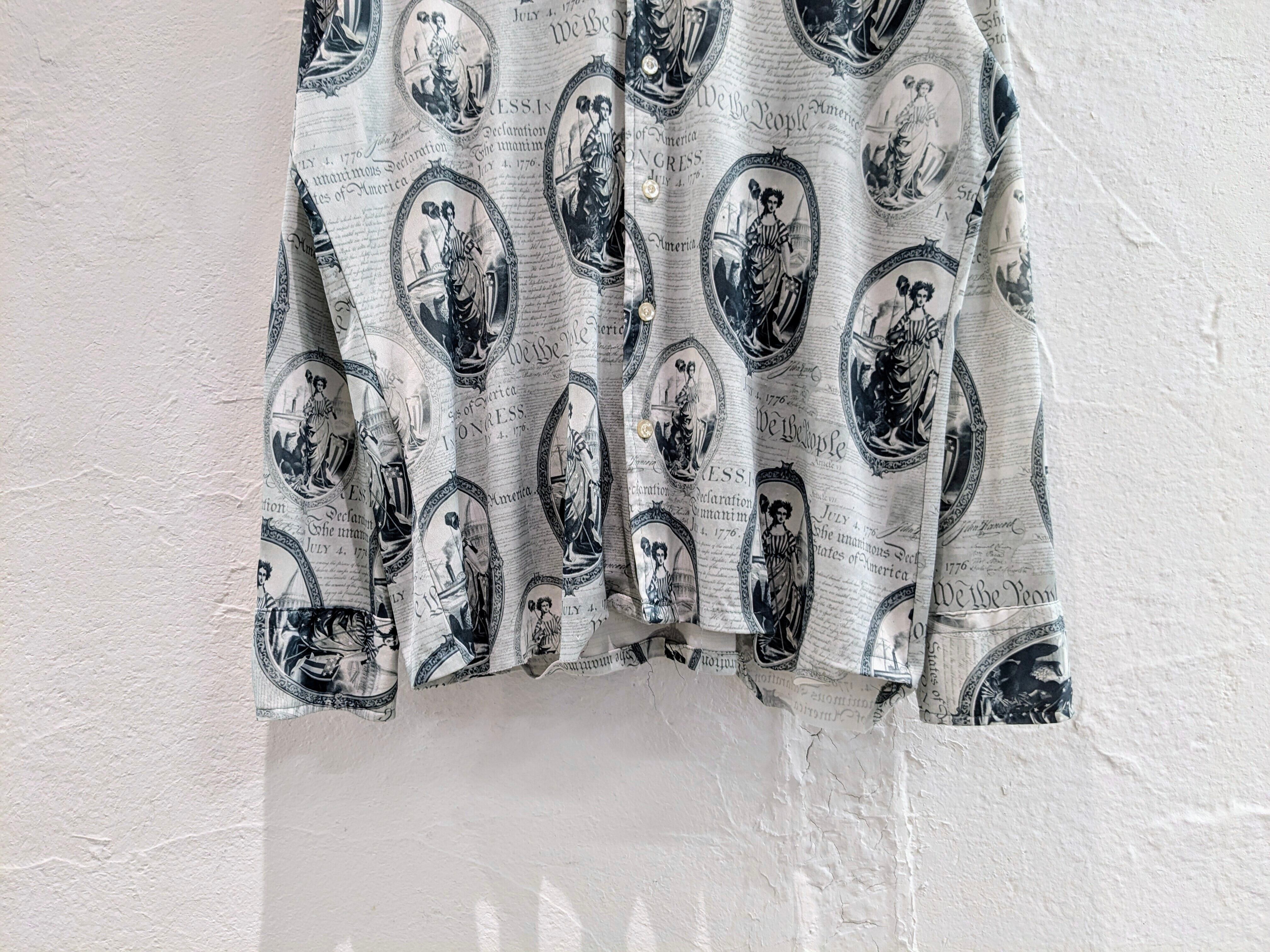1776年7月4日のアメリカ独立宣言のデザインとなります。全面が英字新聞、本のようなプリントがされています。デザインもさることながら、素材感もとてもよく、ポリエステル、レーヨンのような素材でかなりとろみ感、落ち感がある素材で綺麗に着れるのと、さらっと着ていただけます。夏はタンクトップにこれを羽織るだけでもお洒落になるかと。後ろ裾糸飛びあり。