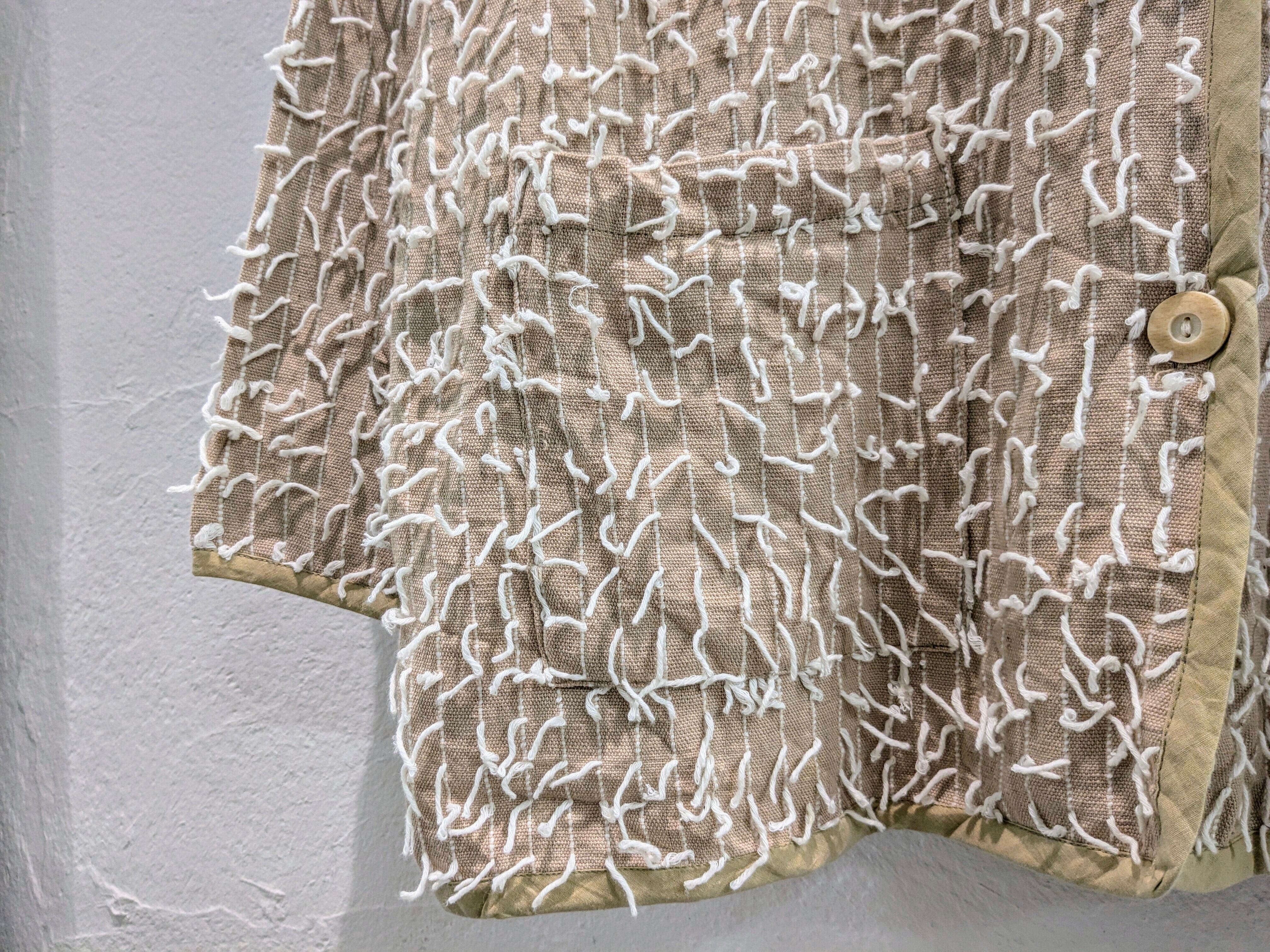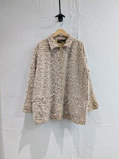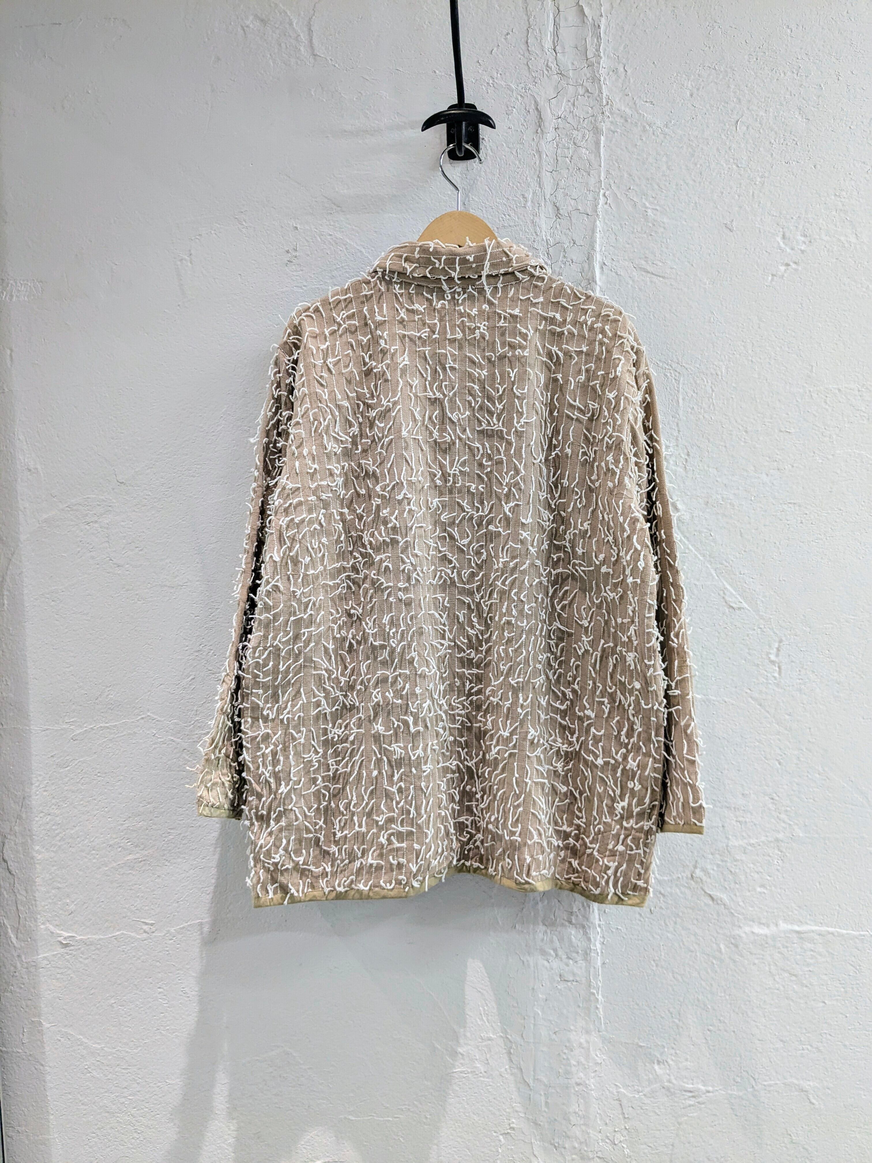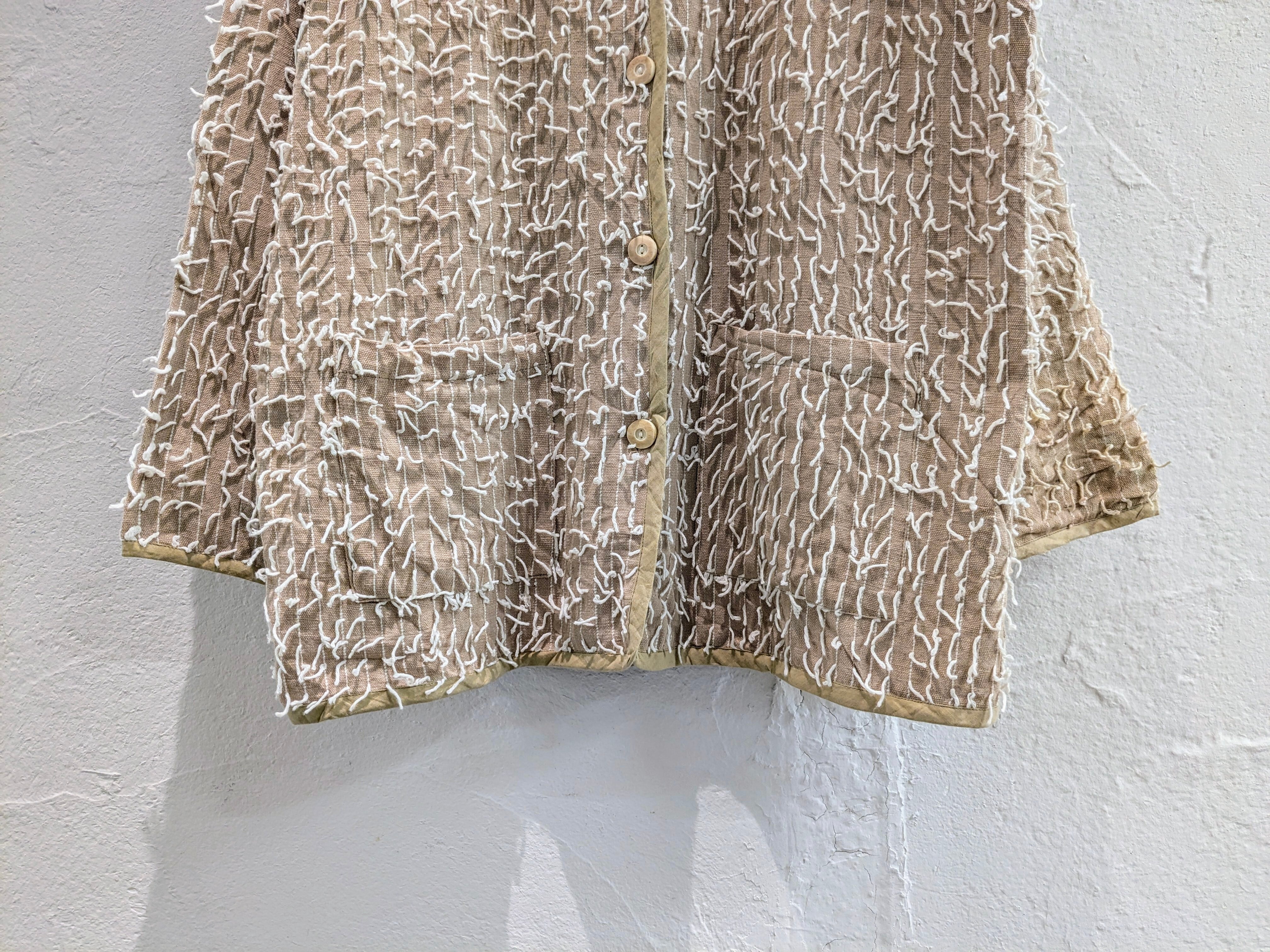 インド製のランダムに糸が飛び出しているデザインのブルゾンになります。シャツのような生地感ですが、裏地が張ってありますので、ハリ感のあるモノになります。形はカバーオールに近いデザインになります。不規則に糸が飛び出しているデザインが斬新でとてもデザイン性があります。袖口に汚れあり。