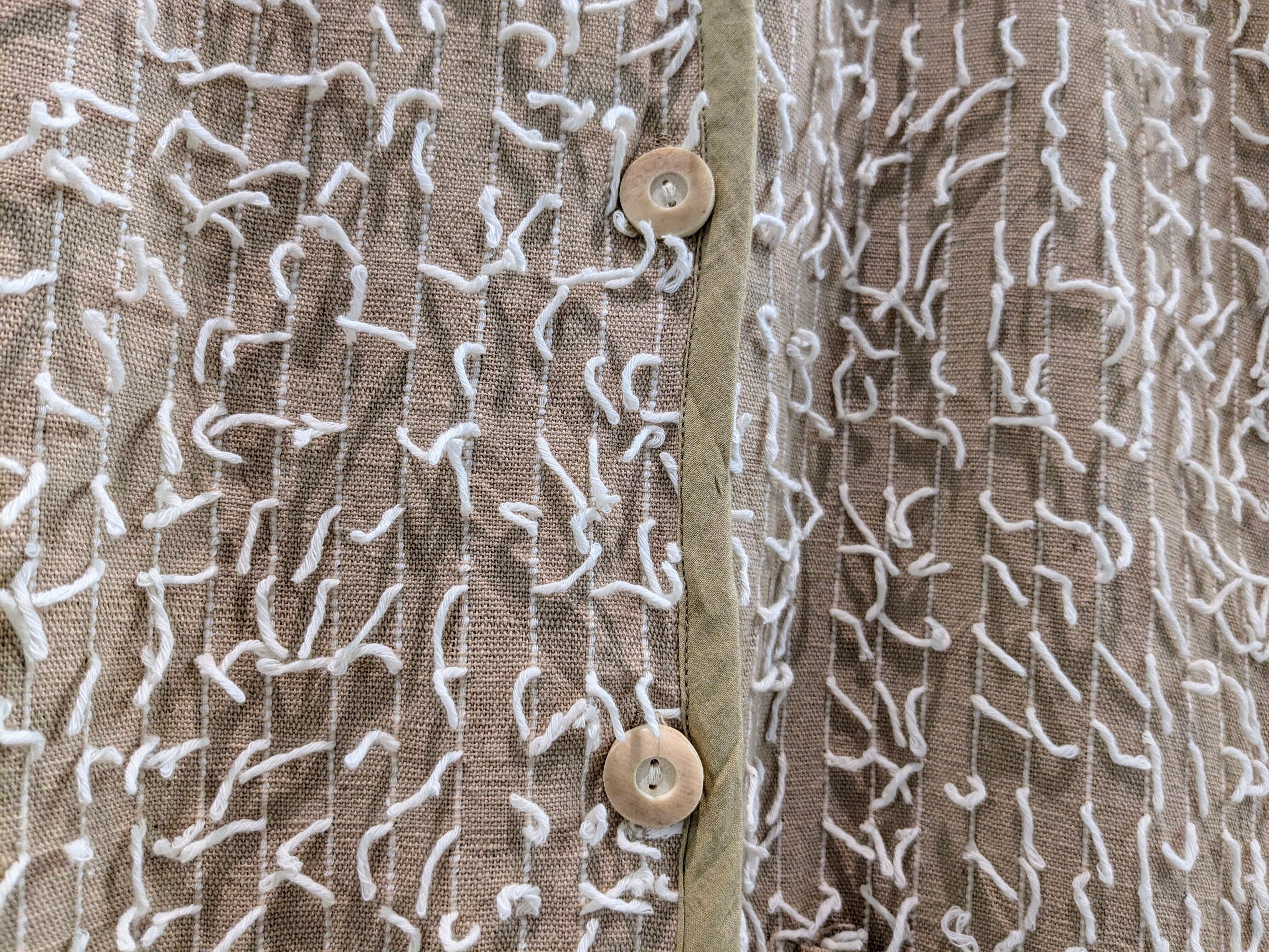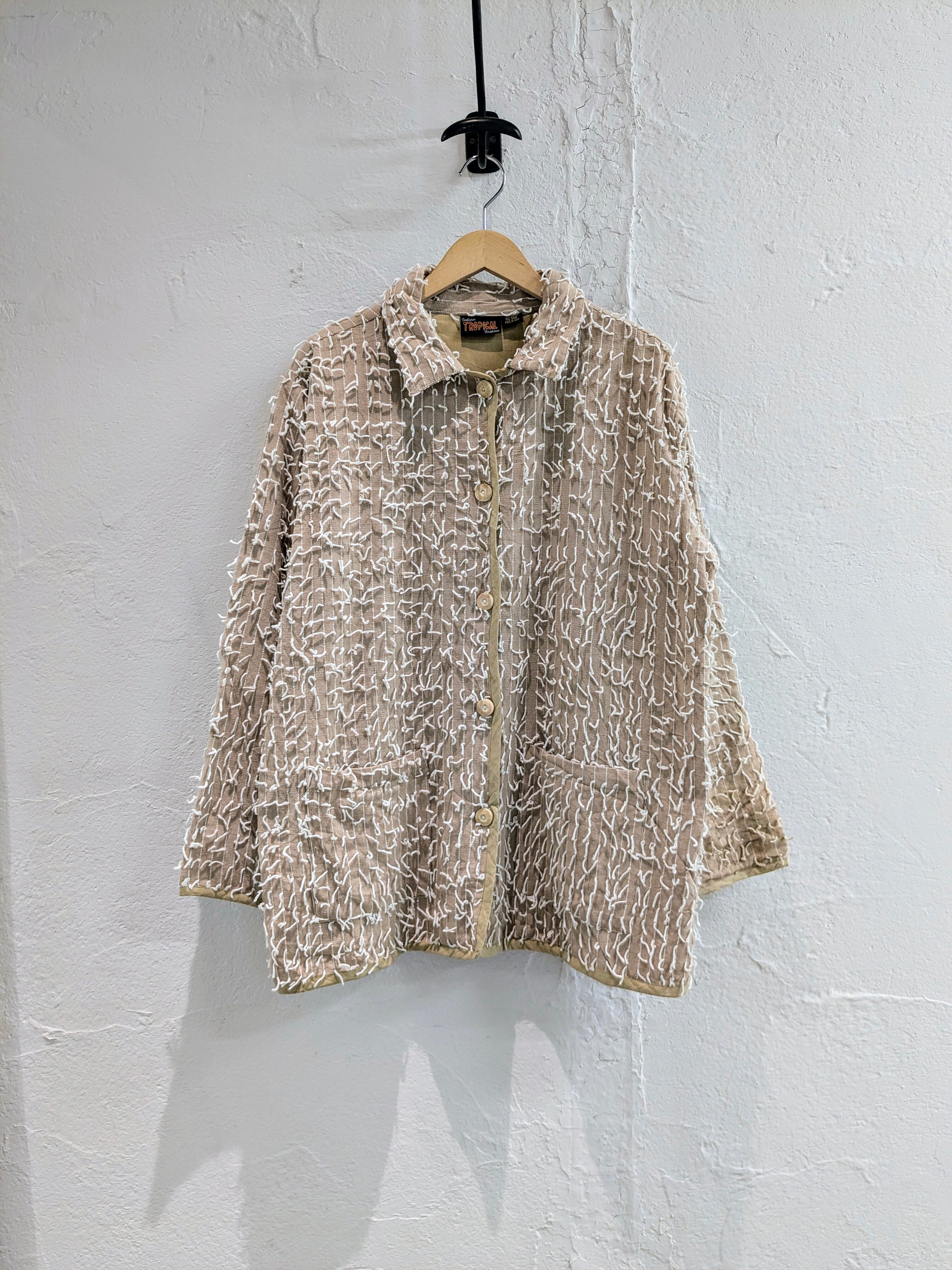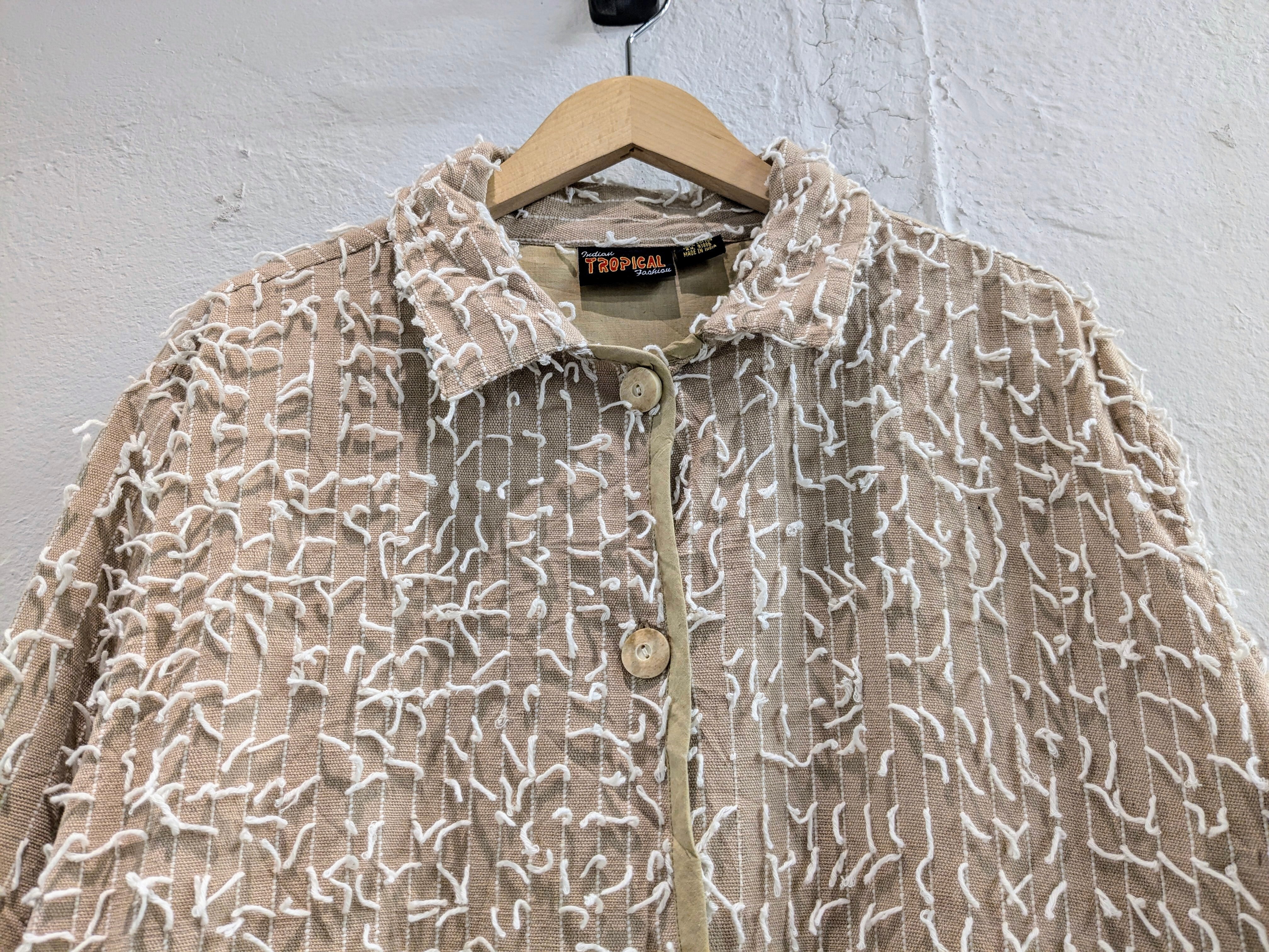 インド製のランダムに糸が飛び出しているデザインのブルゾンになります。シャツのような生地感ですが、裏地が張ってありますので、ハリ感のあるモノになります。形はカバーオールに近いデザインになります。不規則に糸が飛び出しているデザインが斬新でとてもデザイン性があります。袖口に汚れあり。