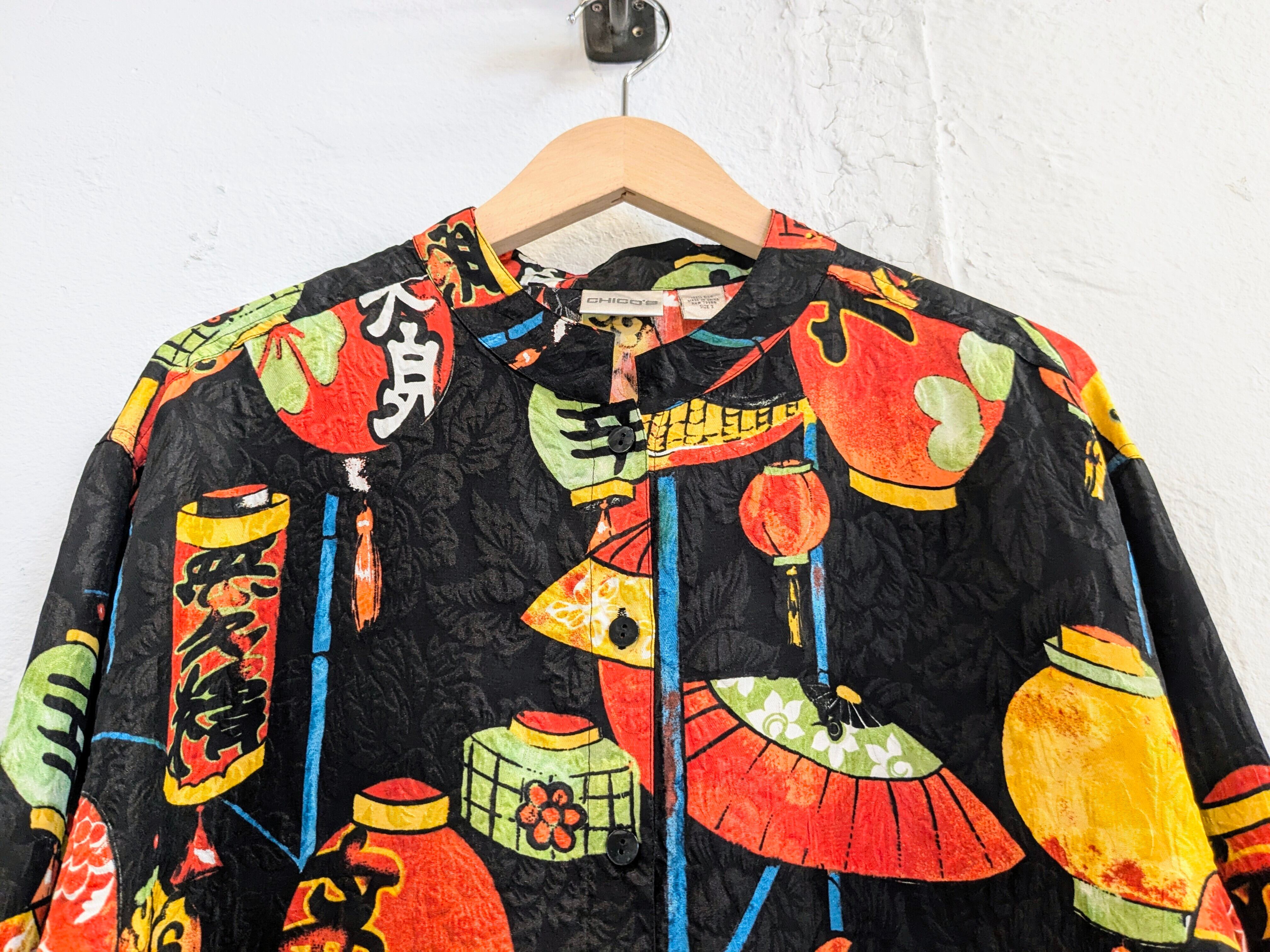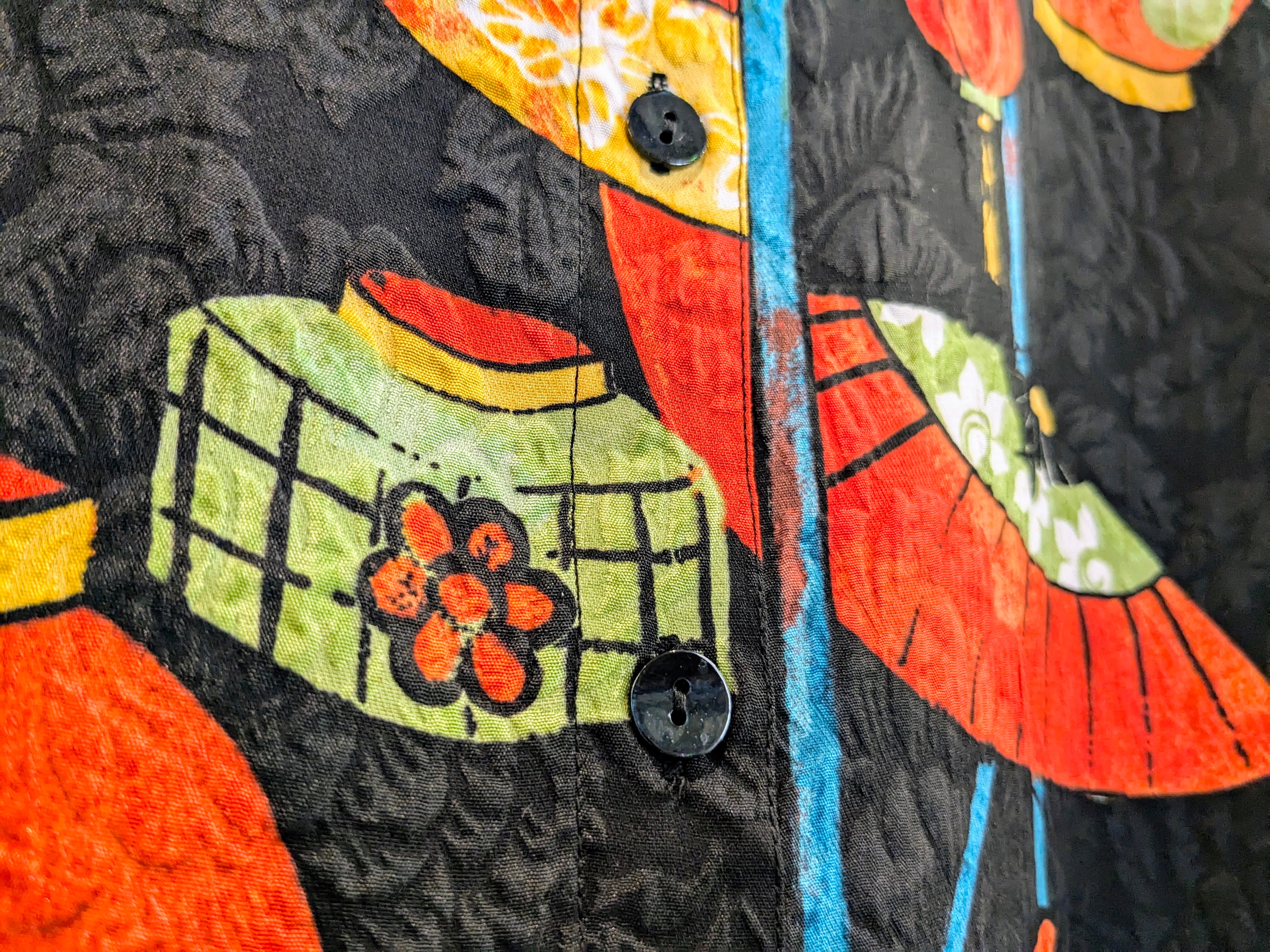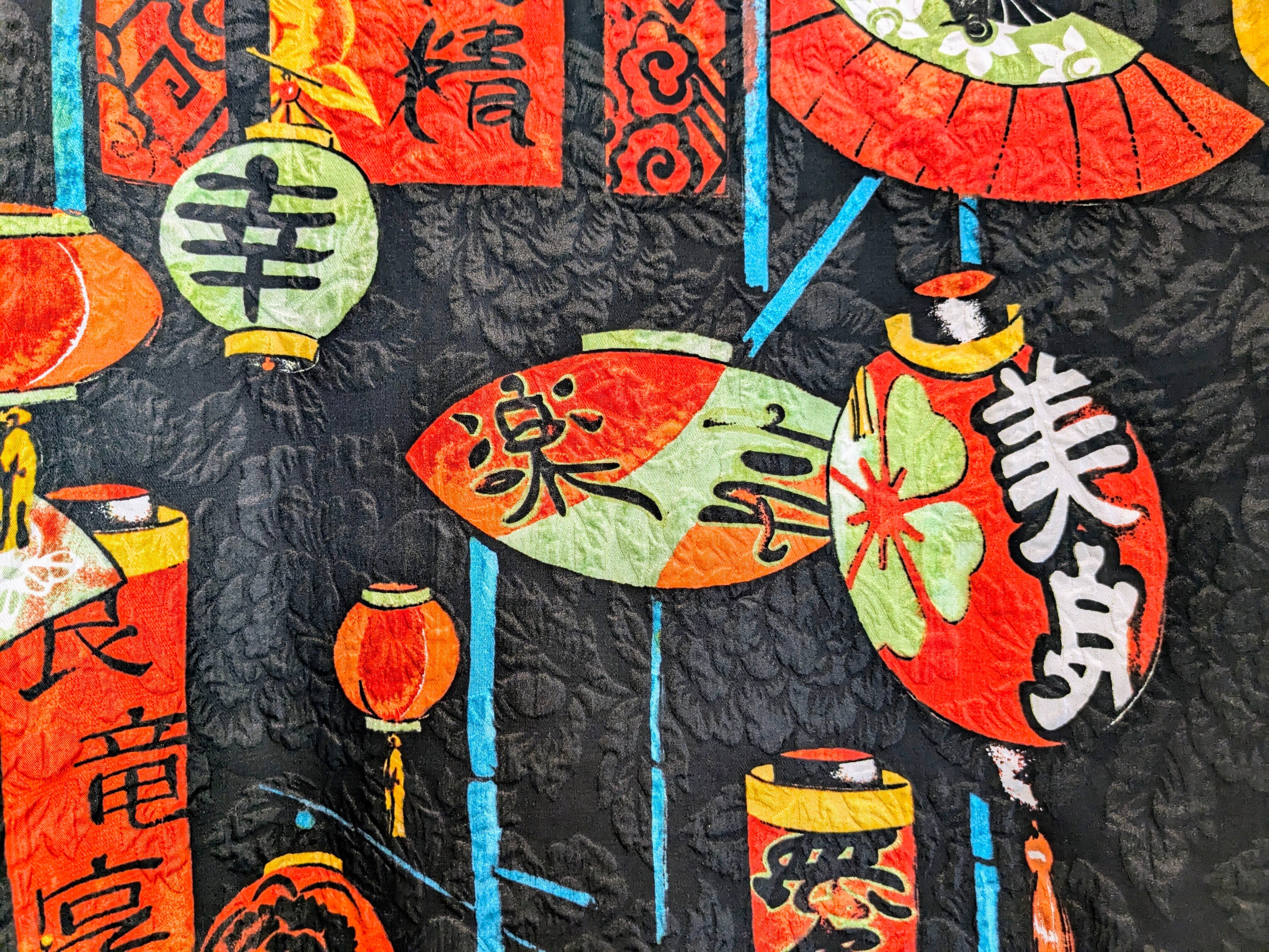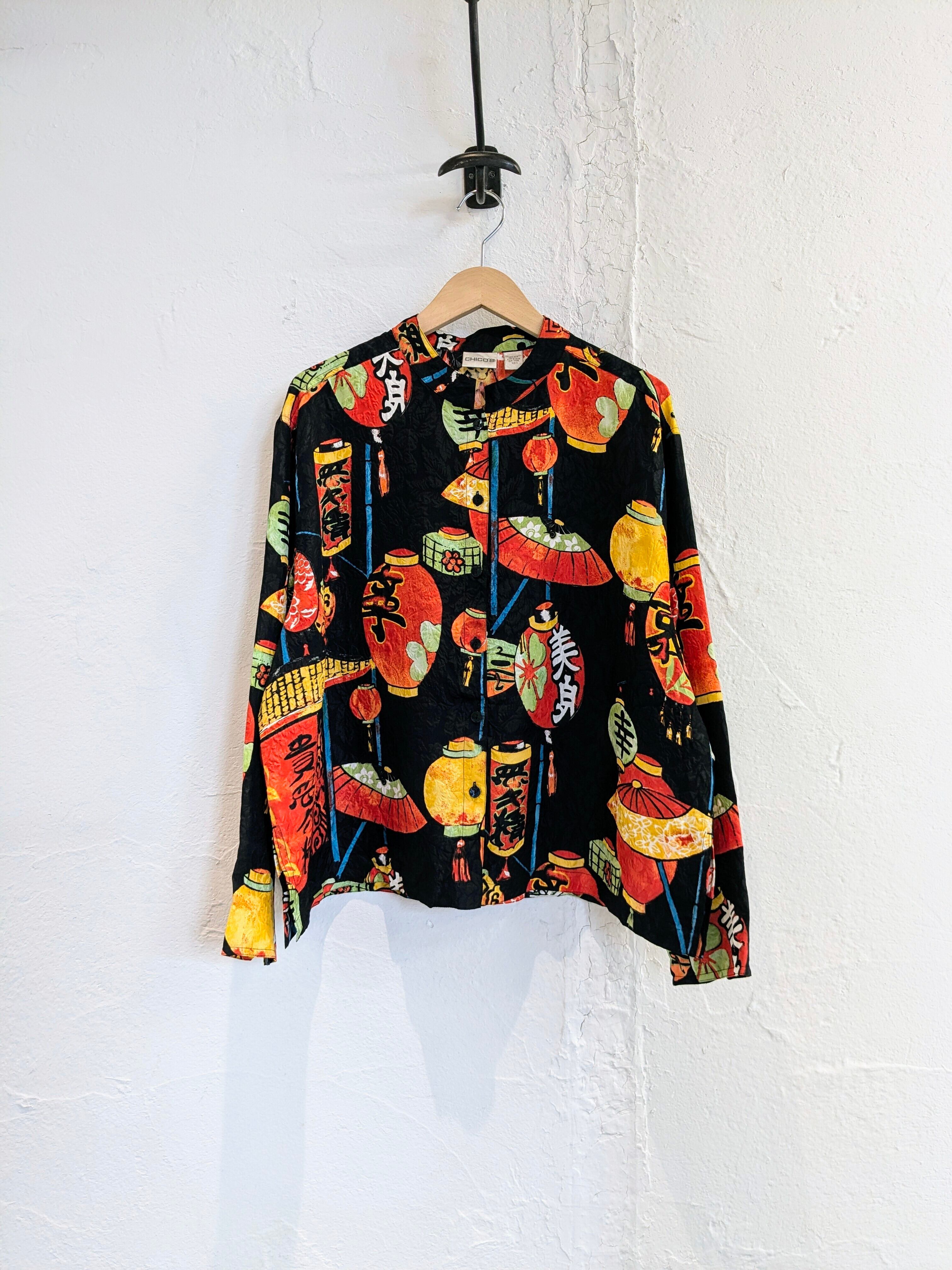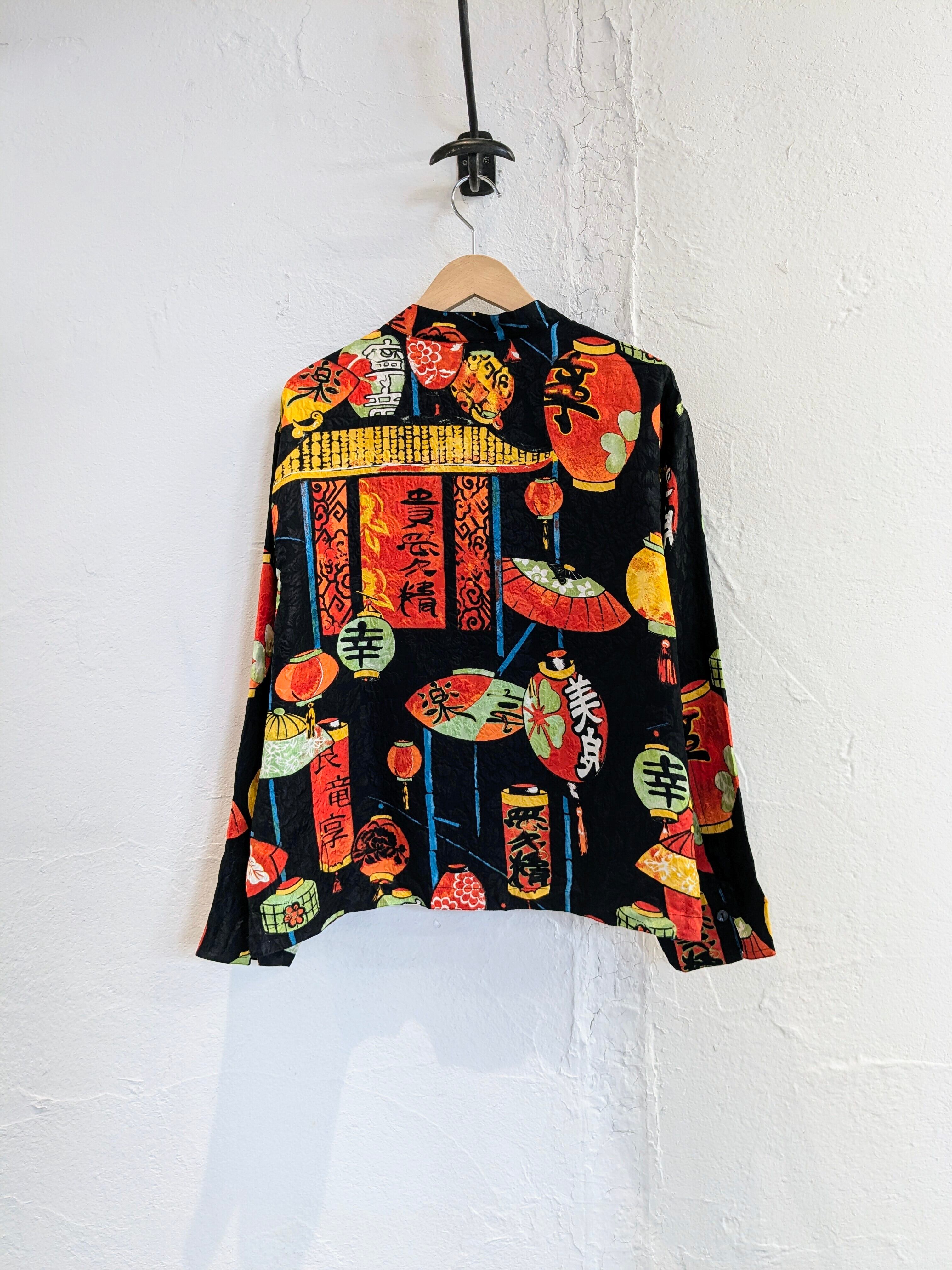 和柄なのか、中国とかの柄なのか曖昧ですが提灯、扇子、漢字などがプリントされたシャツ。しかも、素材はシルクでとても滑らか、落ち感あり、軽いです。プリント以外もよく見ると織り柄になると思いますが、植物の柄も同色ですが入っています。見れば見るほど手の込んだアイテムと分かる一着。アームホールは太め、着丈は短め、身幅はゆったりしているので、フーディの上とかにブルゾン感覚で着ていただくこともできるかと。なかなか出てこないデザインかと思います。