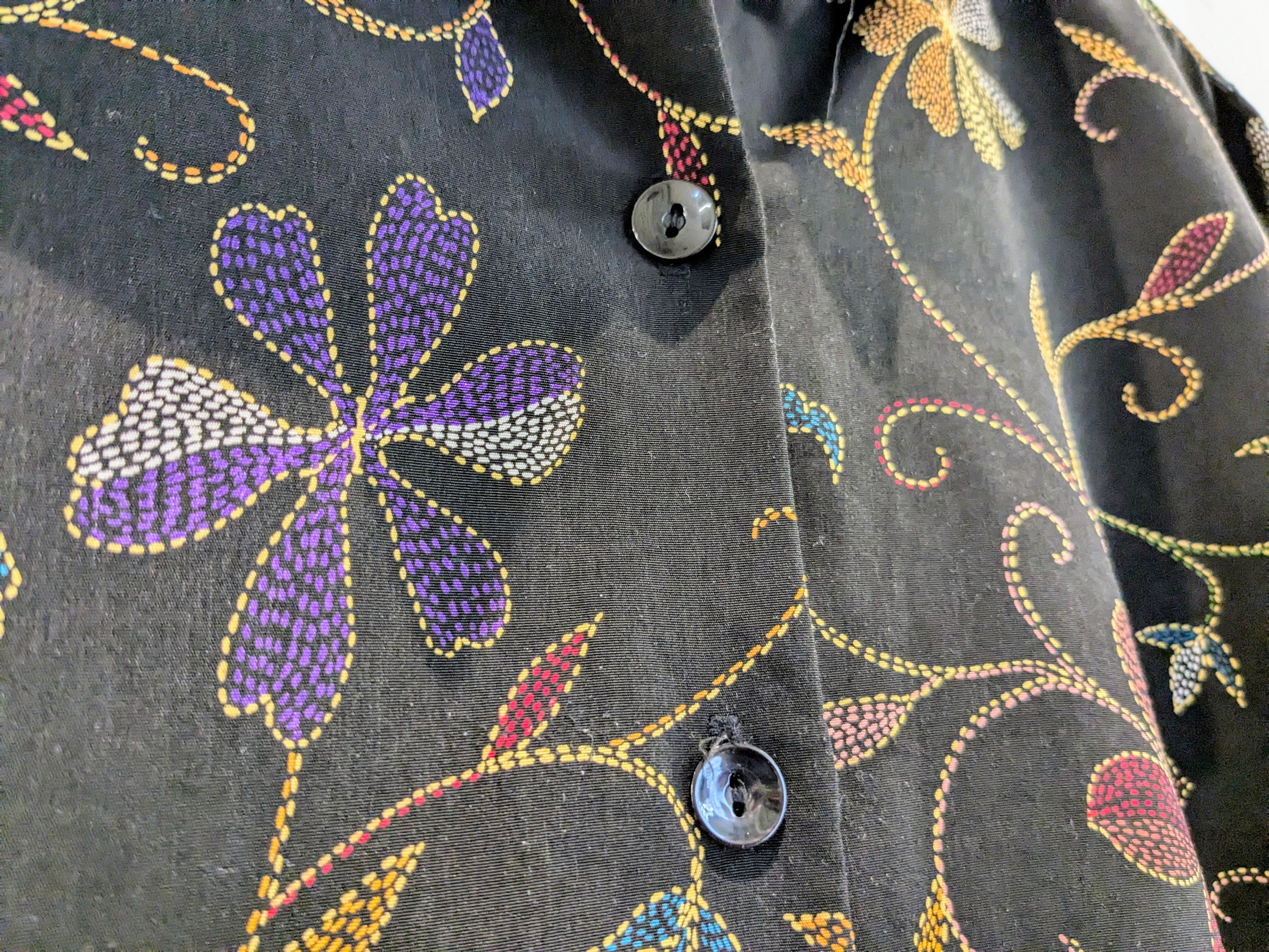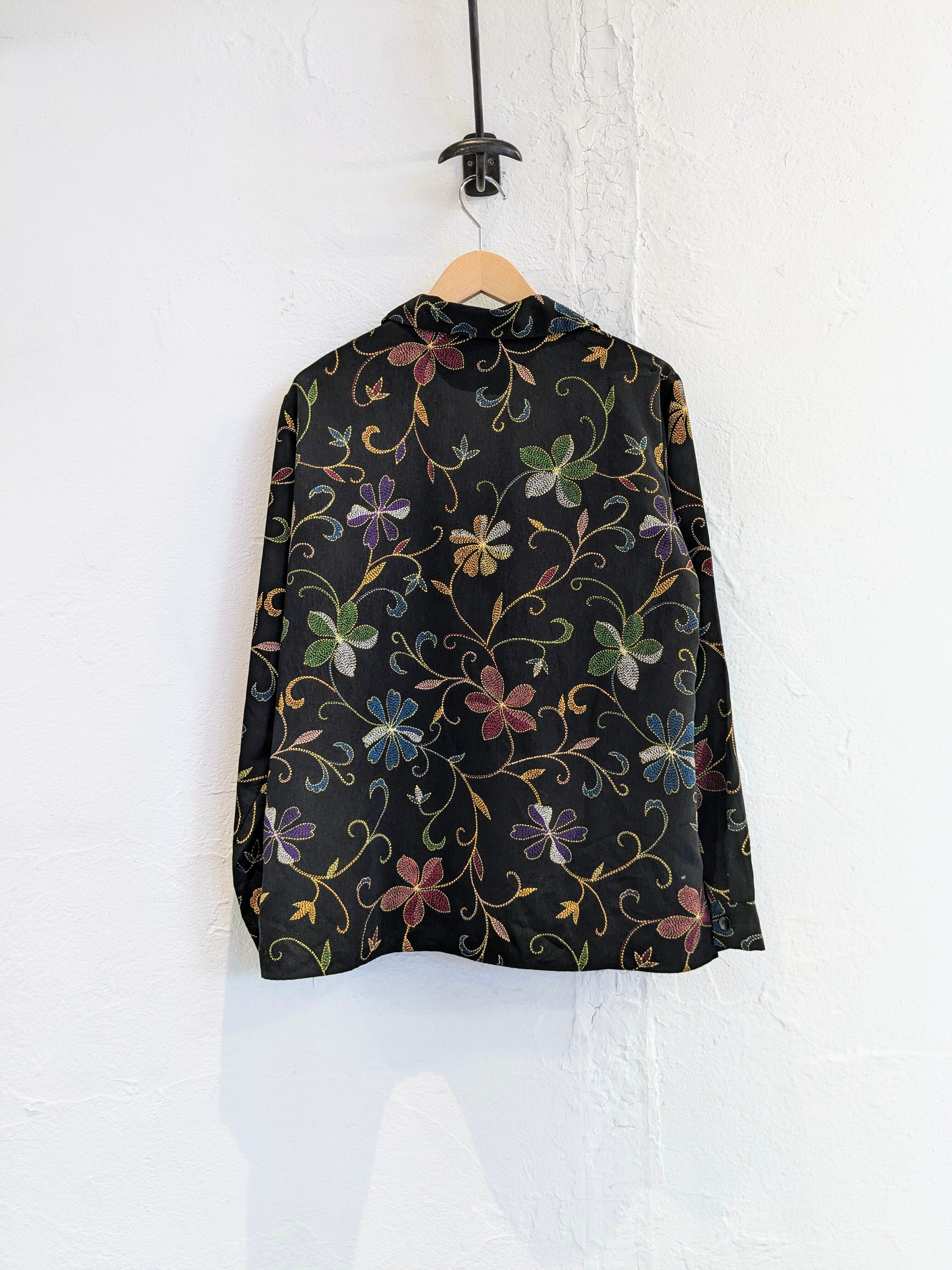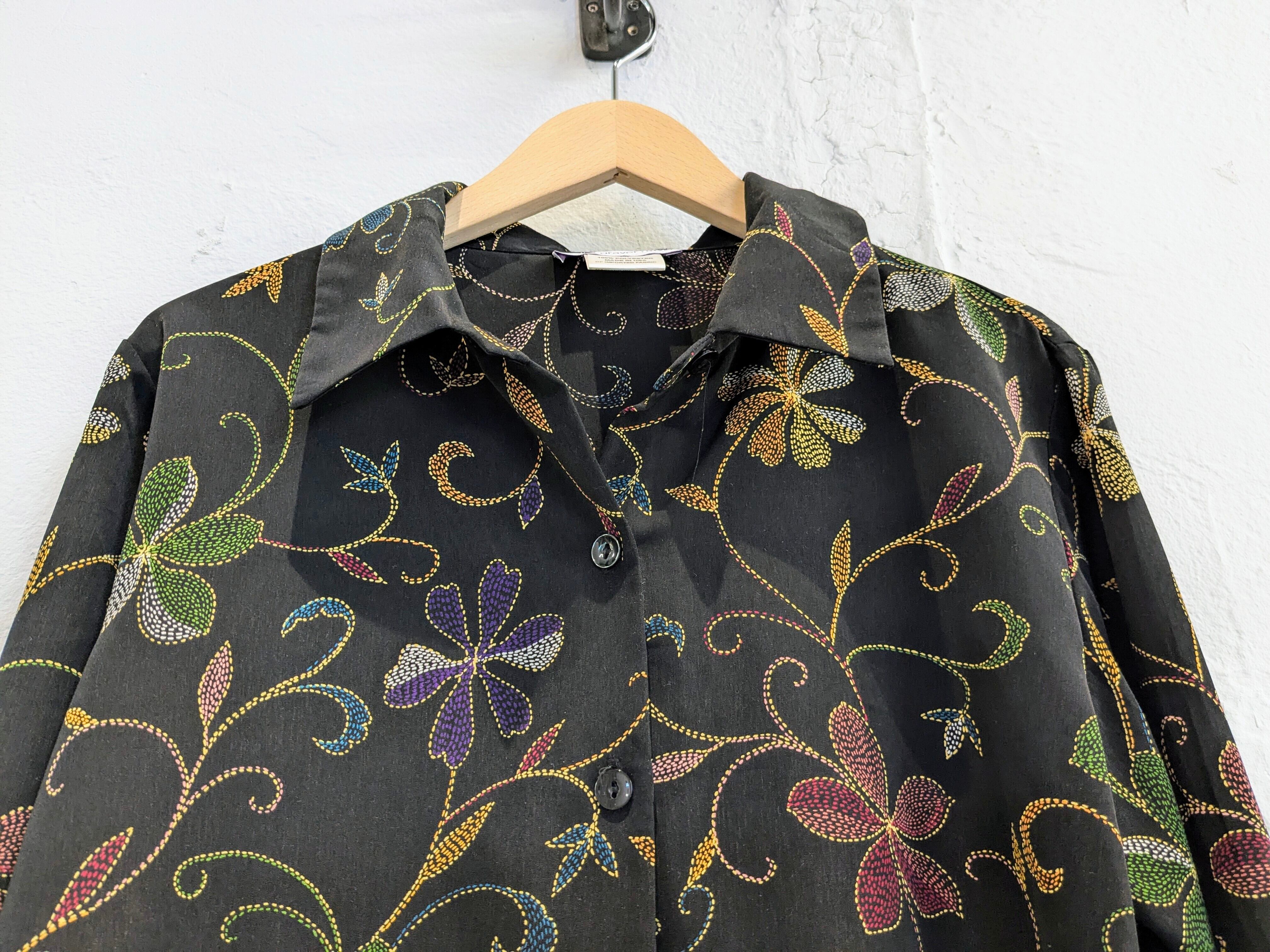 花柄を刺繍してあるようなプリントのシャツ。刺繍かなと思って触ったら、平面な生地感でプリントと気づくような一着。形自体はレギュラーシャツですが、プリントで遊びがあるようなアイテム。色とかも綺麗で面感もとても可愛いです。