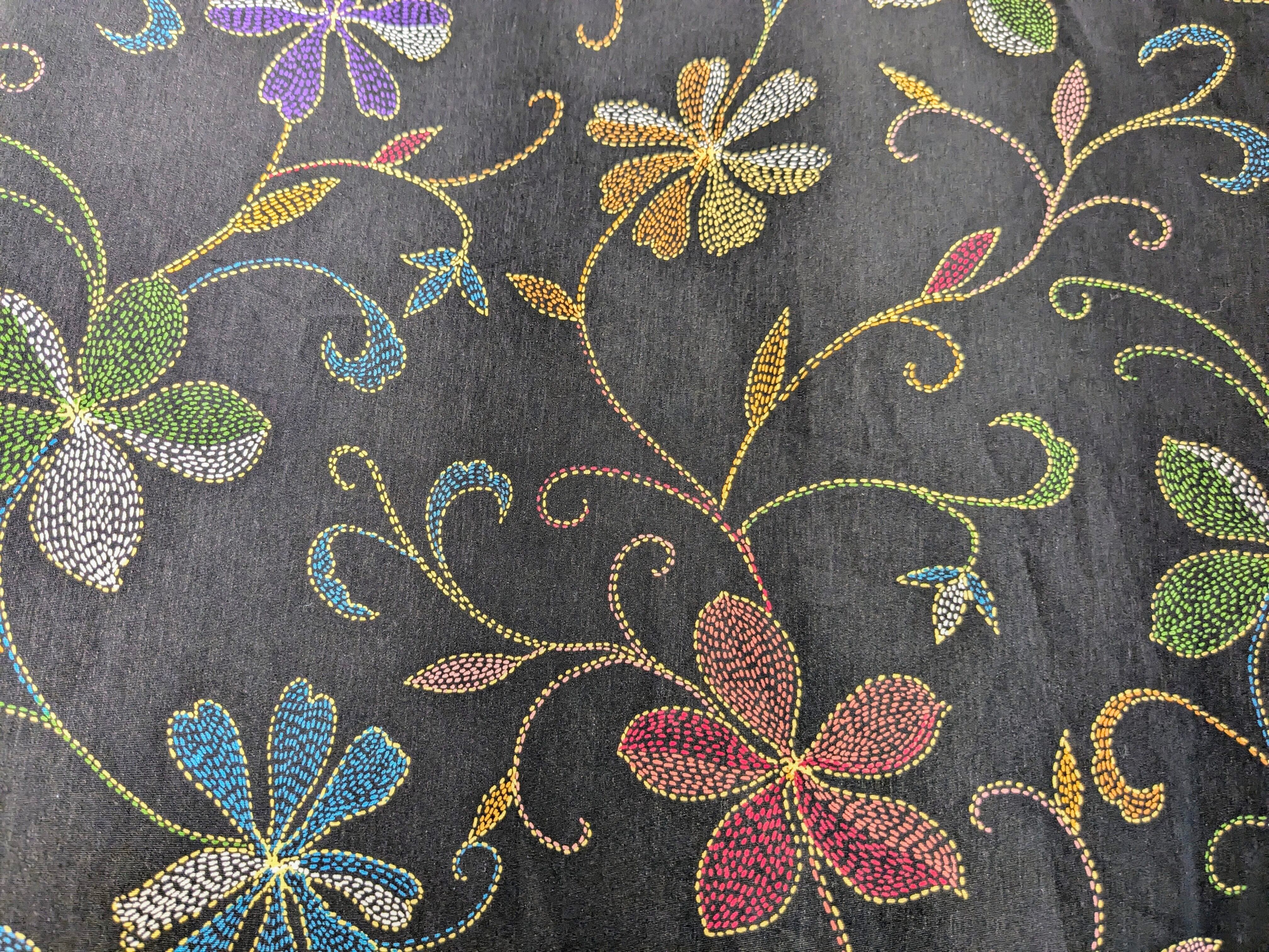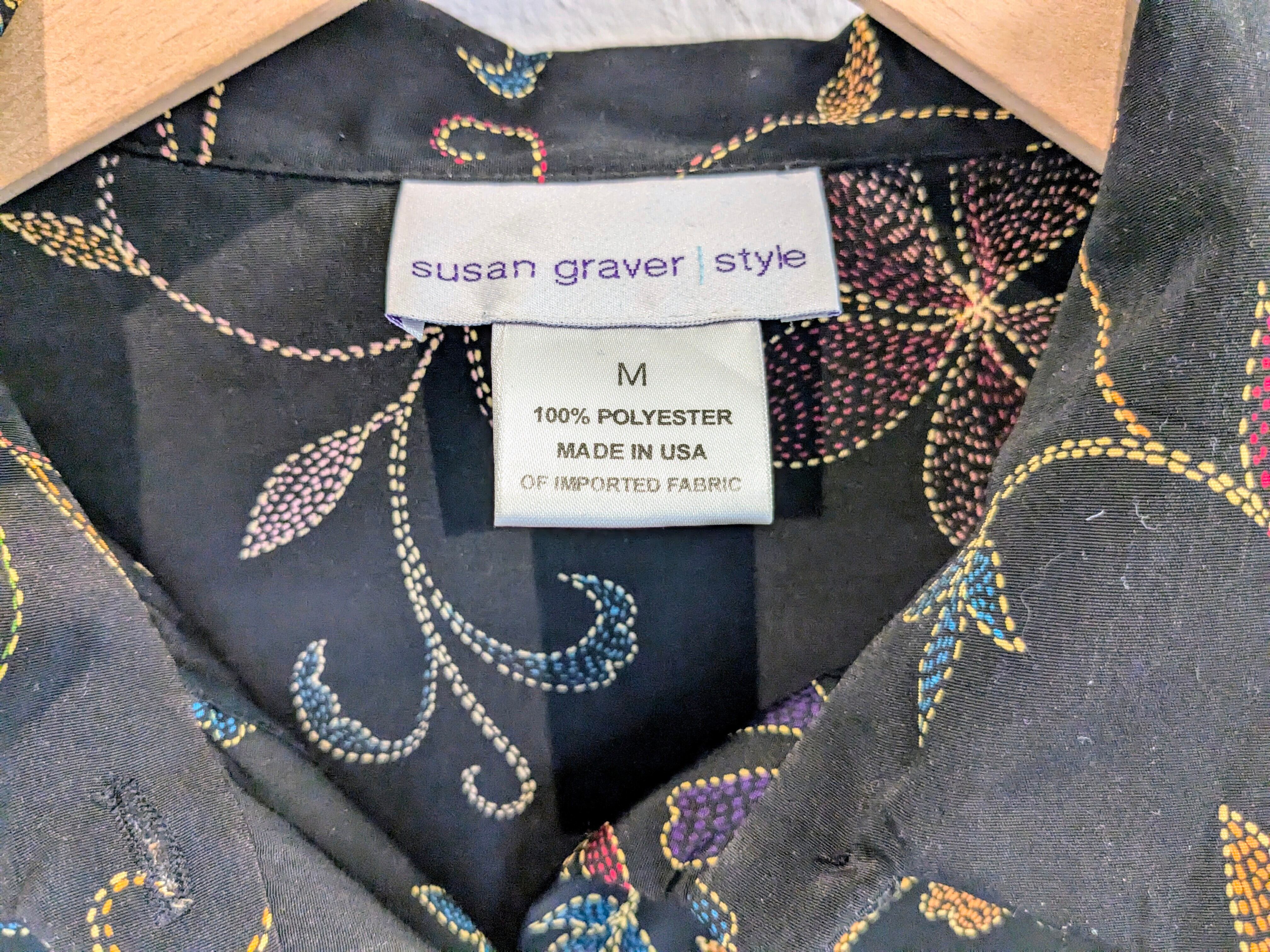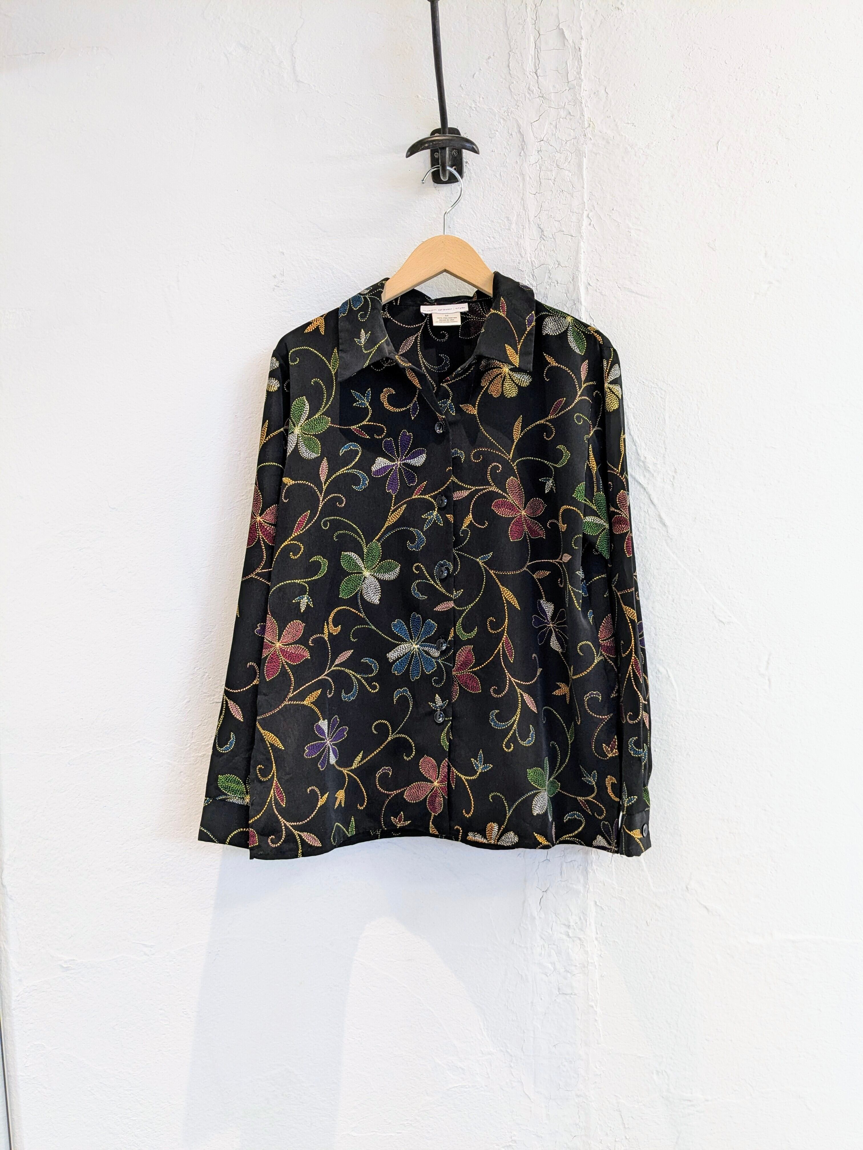 花柄を刺繍してあるようなプリントのシャツ。刺繍かなと思って触ったら、平面な生地感でプリントと気づくような一着。形自体はレギュラーシャツですが、プリントで遊びがあるようなアイテム。色とかも綺麗で面感もとても可愛いです。