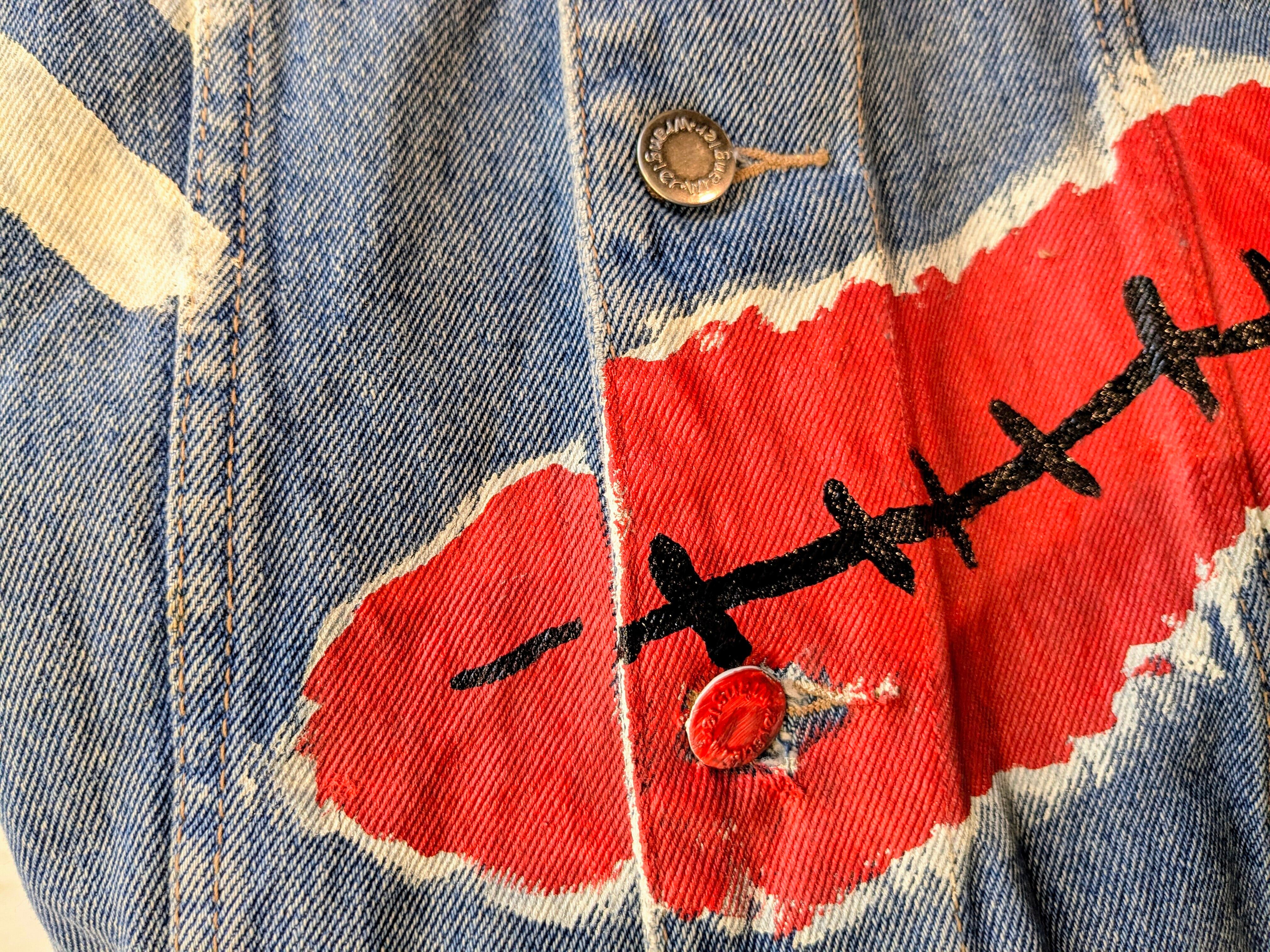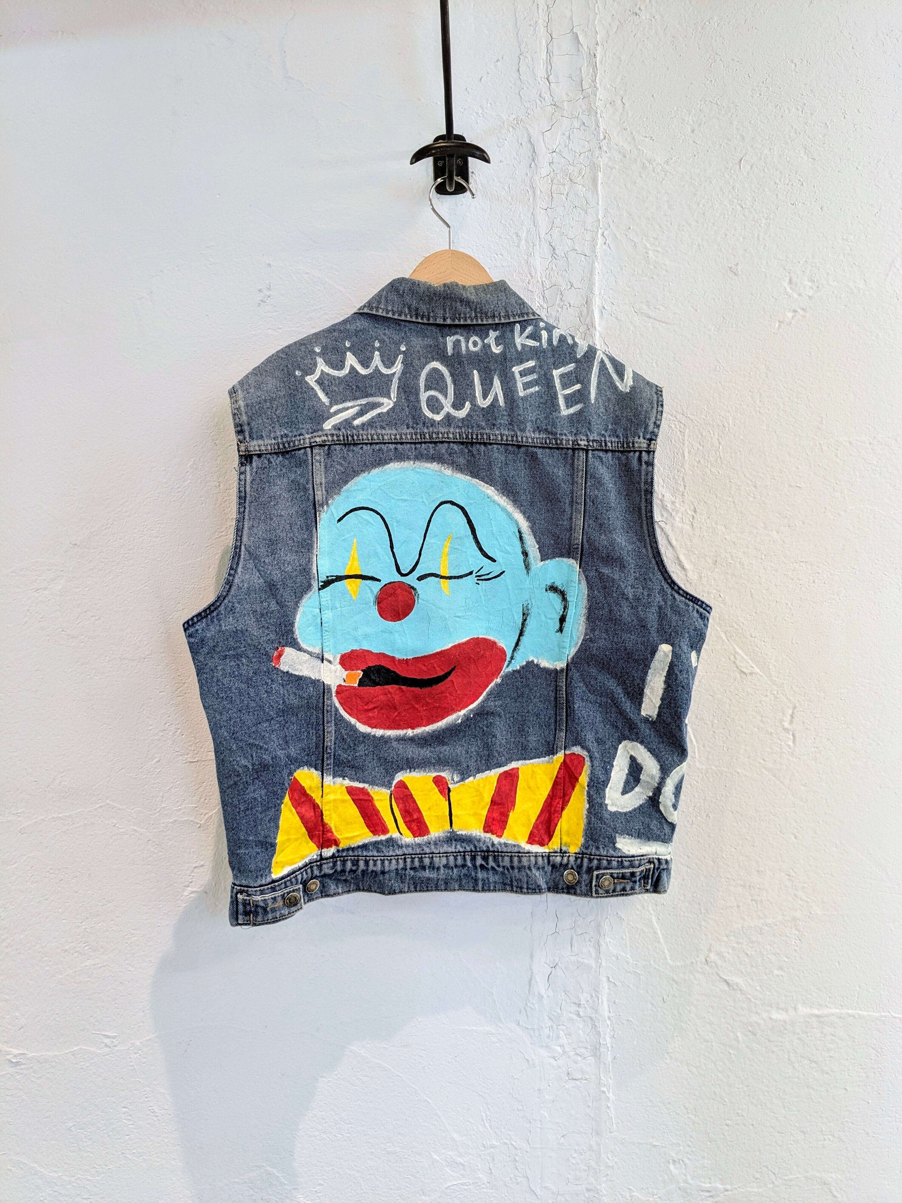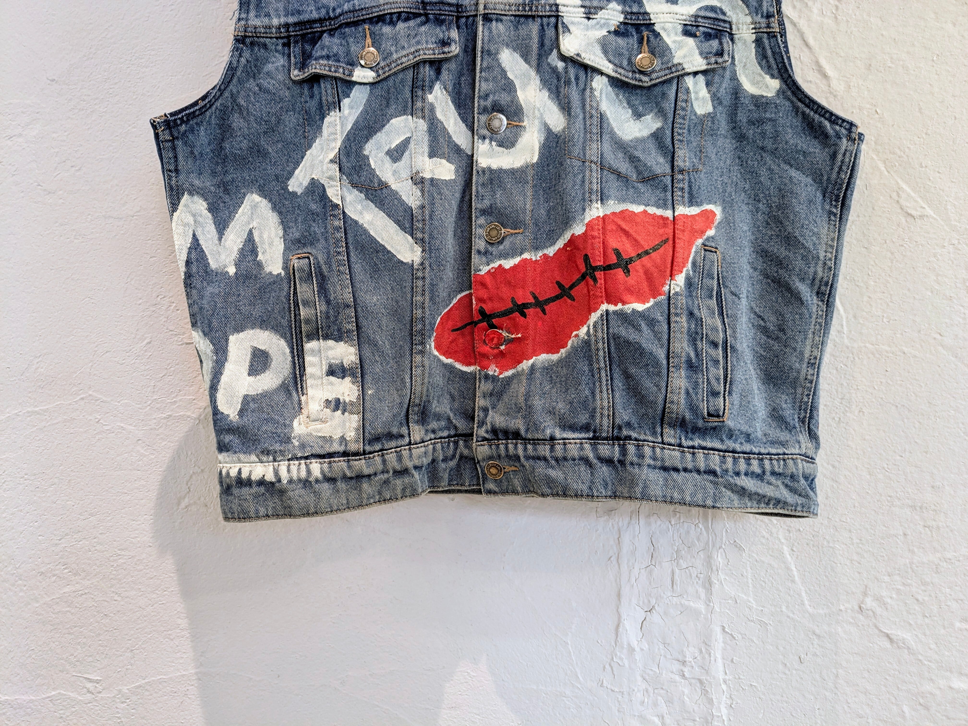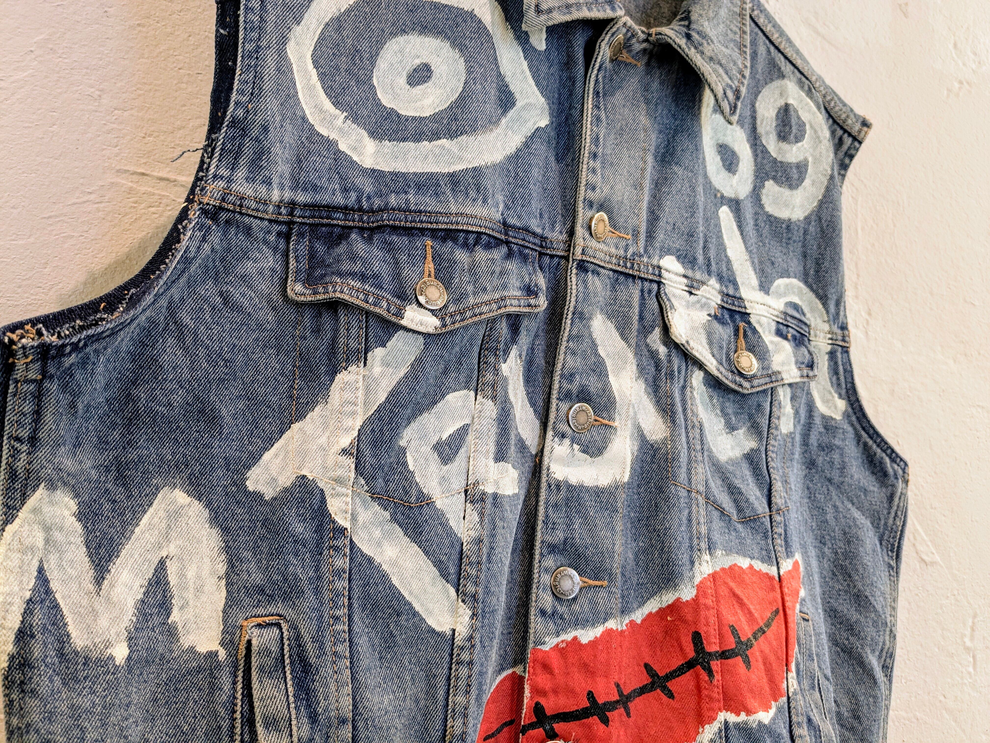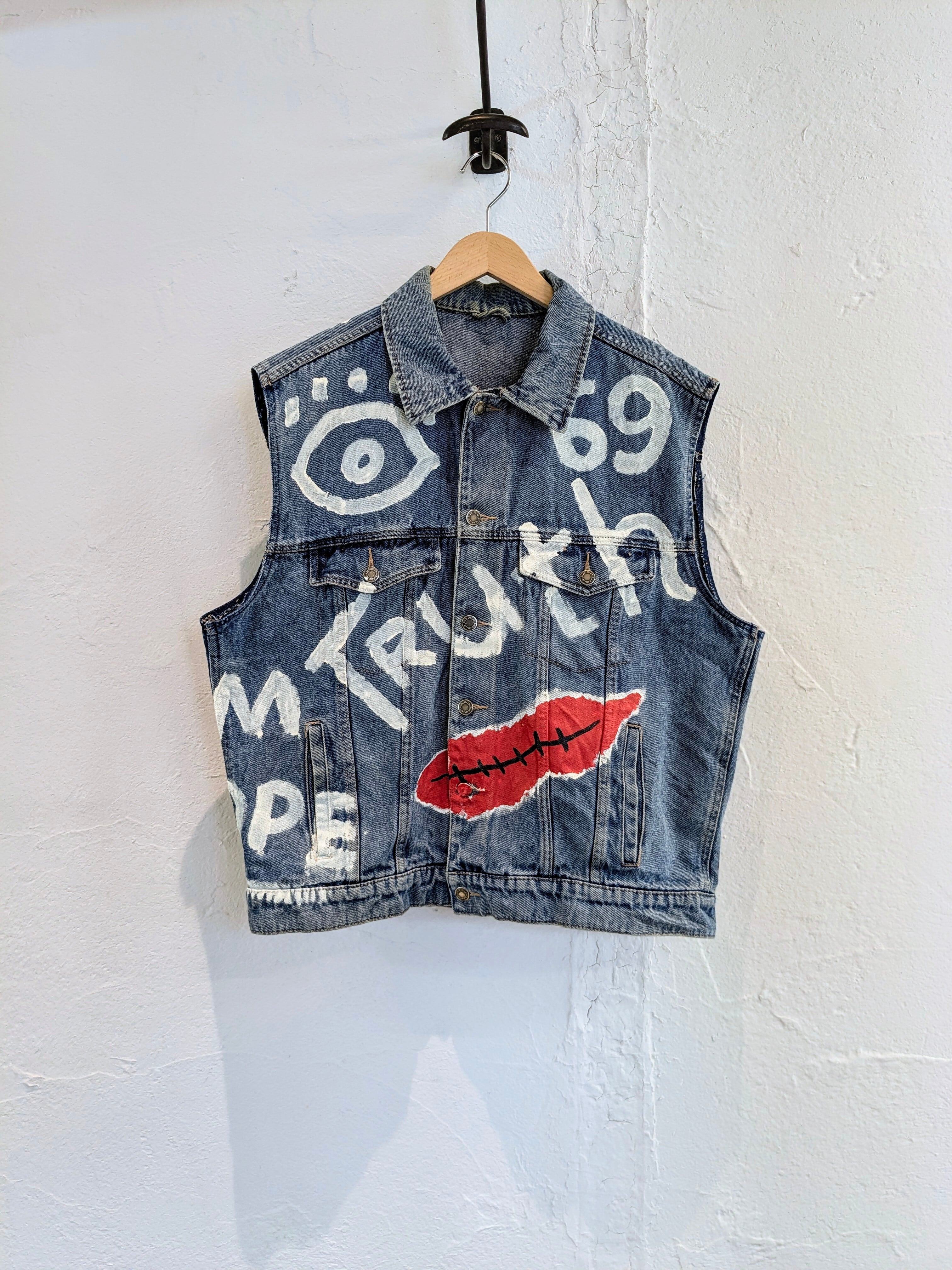Wranglerのデニムブルゾンの袖を切り、ベストにしたアイテム。そこに手描きでイラストを入れている一着。身幅などはゆったりとしているので、スウェットなどの上はもちろん、コートとかブルゾンの上から着るのもアリかと。